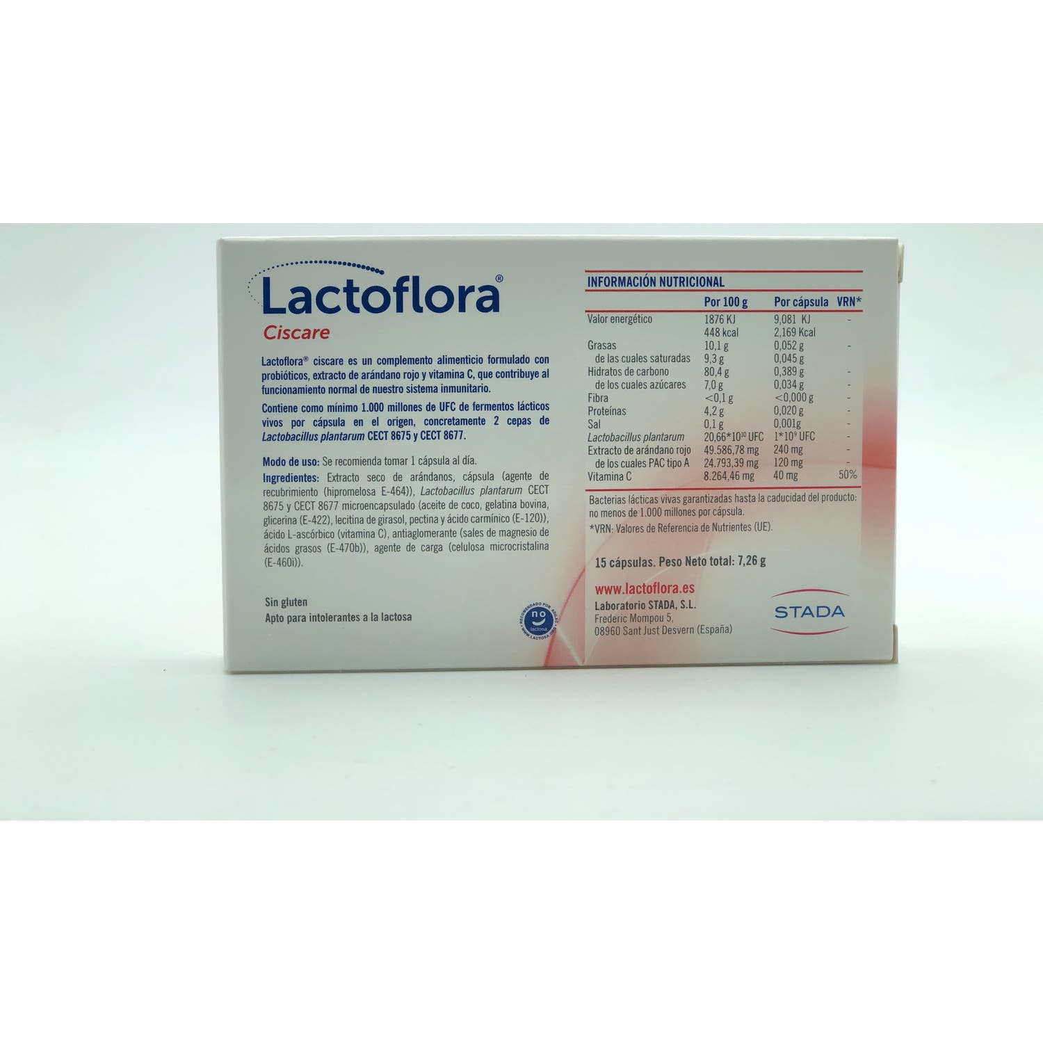 Lactoflora Ciscare 15caps es un complemento alimenticio formulado con fermentos lácticos vivos, extracto de arándano rojo americano y vitamina C.