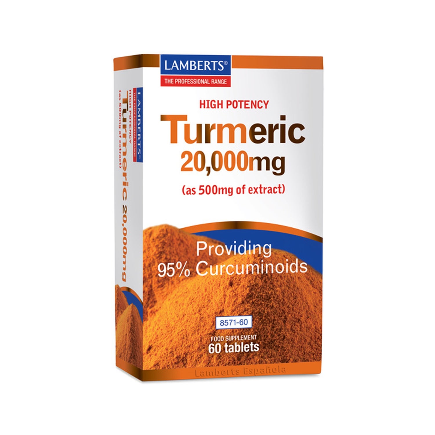 Lamberts Cúrcuma 20.000mg 60Tabs es un suplemento dietético elaborado con cúrcuma, adecuado para personas que siguen una dieta vegetariana o vegana. Se recomienda no exceder la dosis diaria recomendada y no está recomendado para mujeres menores de 50 años.