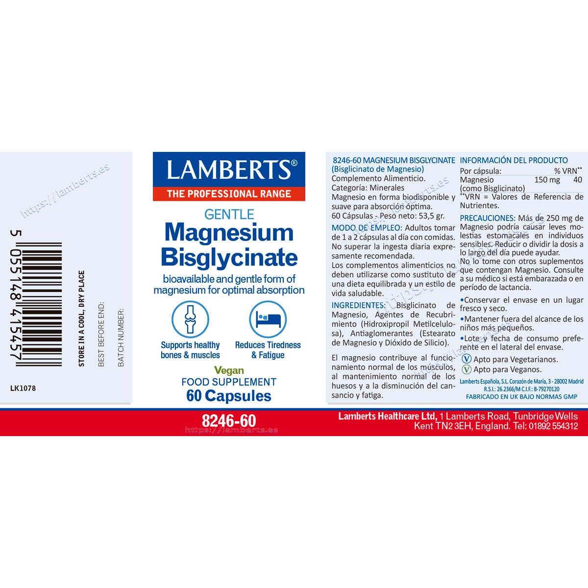 El Magnesio Bisglicinato de Lamberts® proporciona 150 mg de magnesio elemental por cápsula. Esta forma aminoquelada, unida a glicina, es reconocida por su excelente tolerancia, especialmente en personas con sensibilidad intestinal o que deseen evitar posible efecto laxante.