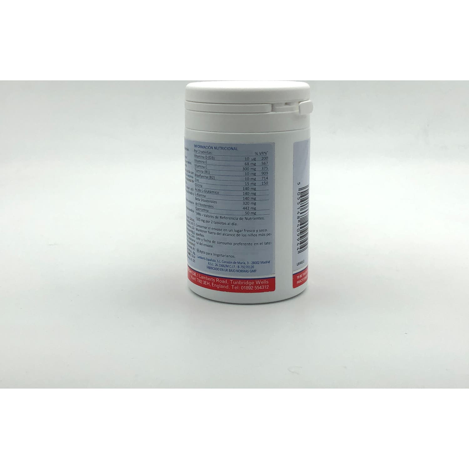 Cada dosis diaria de 2 comprimidos aporta vitaminas E, C, D, riboflavina, zinc, L-Alanina, Glicina, L-Ácido Glutámico, quercetina, Beta Sitosterol y tiamina.