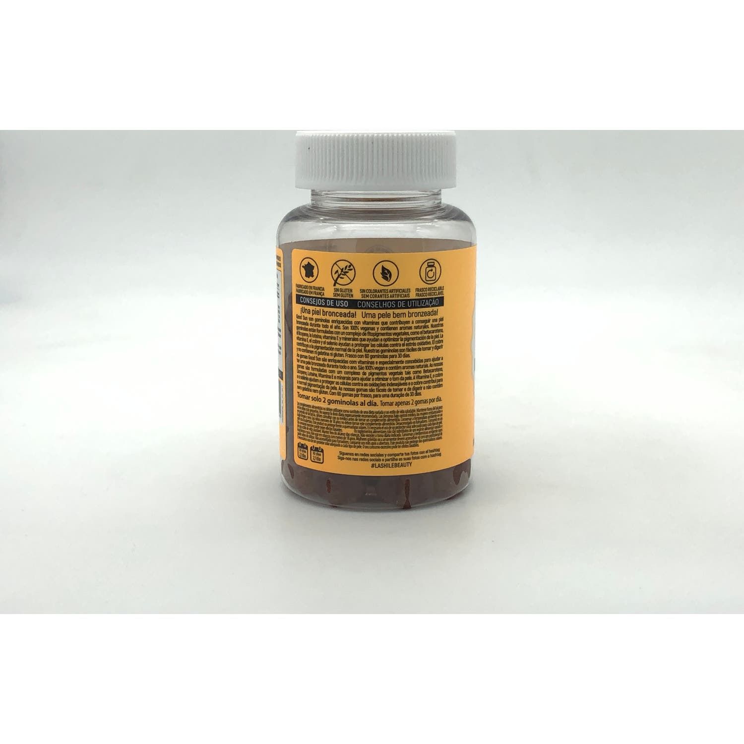 Lashilé Good Sun 60 gummies es un complemento alimenticio con sabor a melocotón que ayudan a tener un tono bronceado durante todo el año.