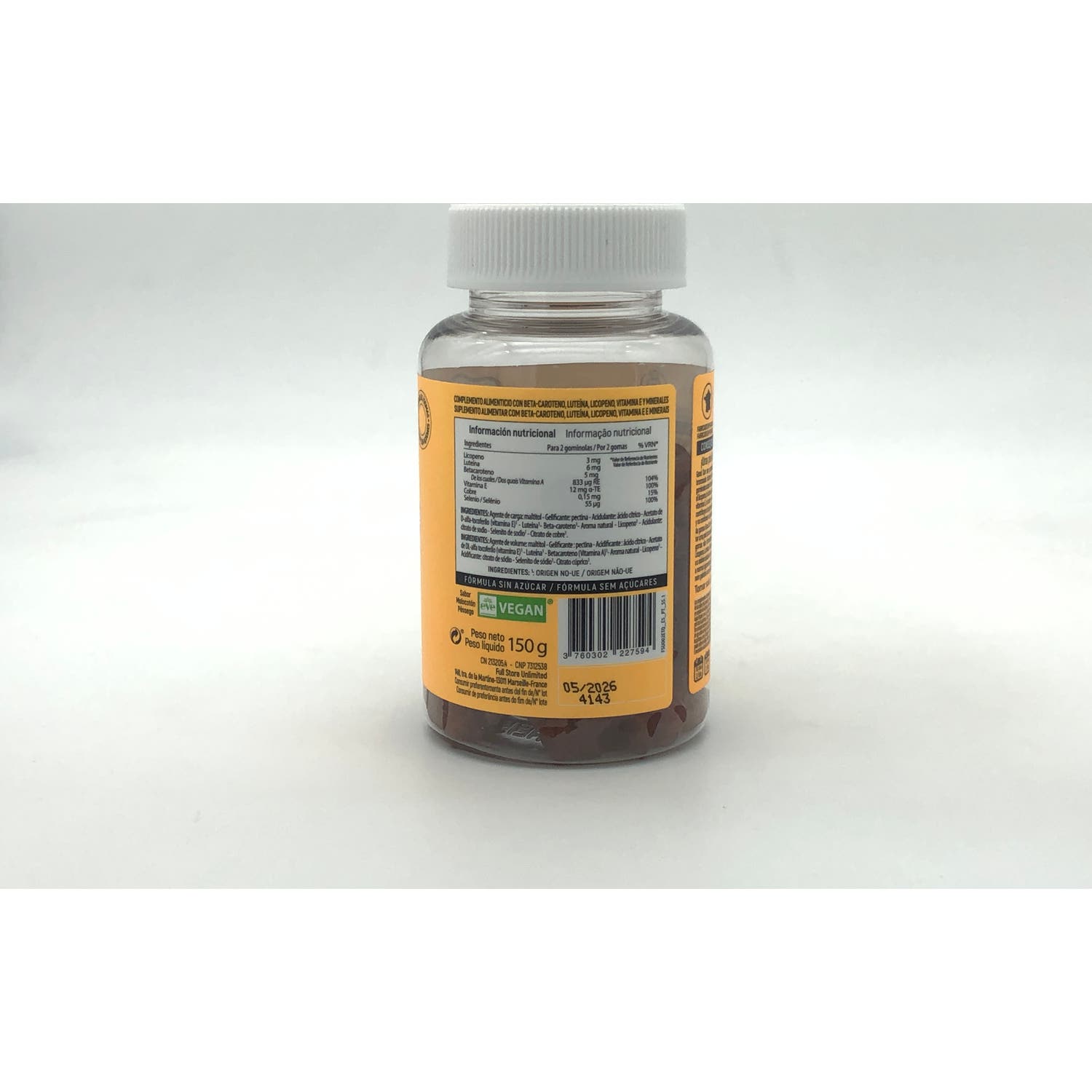 Agente de carga: maltitol - Agente gelificante: pectina - Acidulante: ácido cítrico - Dl-alfa-tocoferilo acetato (vitamina E) - Luteína - Betacaroteno - Aroma natural - Licopeno - Acidulante: citrato de sodio - Selenito de sodio - Agente de recubrimiento: cera de carnauba - Citrato de cobre.