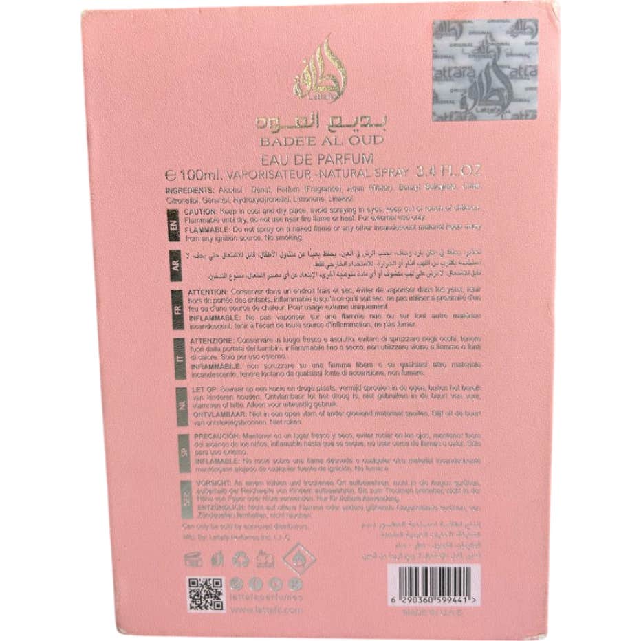 Lattafa Ladies Badee Al Oud Noble Blush 100 ml es un eau de parfum femenino de la familia olfativa floral frutal gourmand, pensado para momentos especiales. Ofrece una fragancia sofisticada y romántica, con un carácter dulce y envolvente y un toque oriental gourmand de larga duración.
