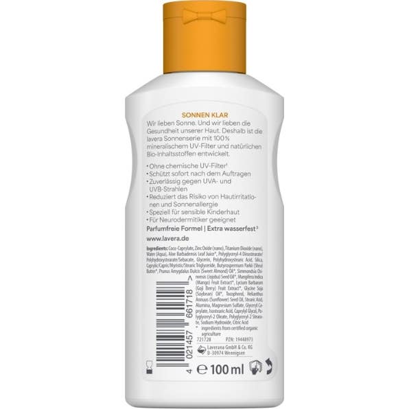 Lavera Loción Solar Sensitiv Kids SPF 50 es un protector solar especialmente formulado para la delicada piel de los niños. Proporciona una protección inmediata gracias a su filtro UV 100% mineral, sin la inclusión de filtros químicos, lo que contribuye a disminuir el riesgo de irritaciones y reacciones alérgicas causadas por la exposición solar.