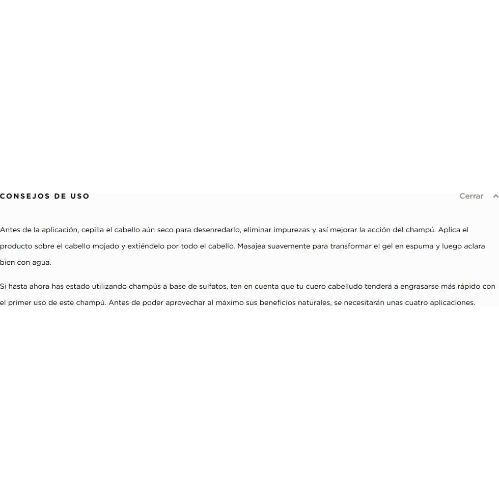 Si hasta ahora has estado utilizando champús a base de sulfatos, ten en cuenta que tu cuero cabelludo tenderá a engrasarse más rápido con el primer uso de este champú. Antes de poder aprovechar al máximo sus beneficios naturales, se necesitarán unas cuatro aplicaciones.