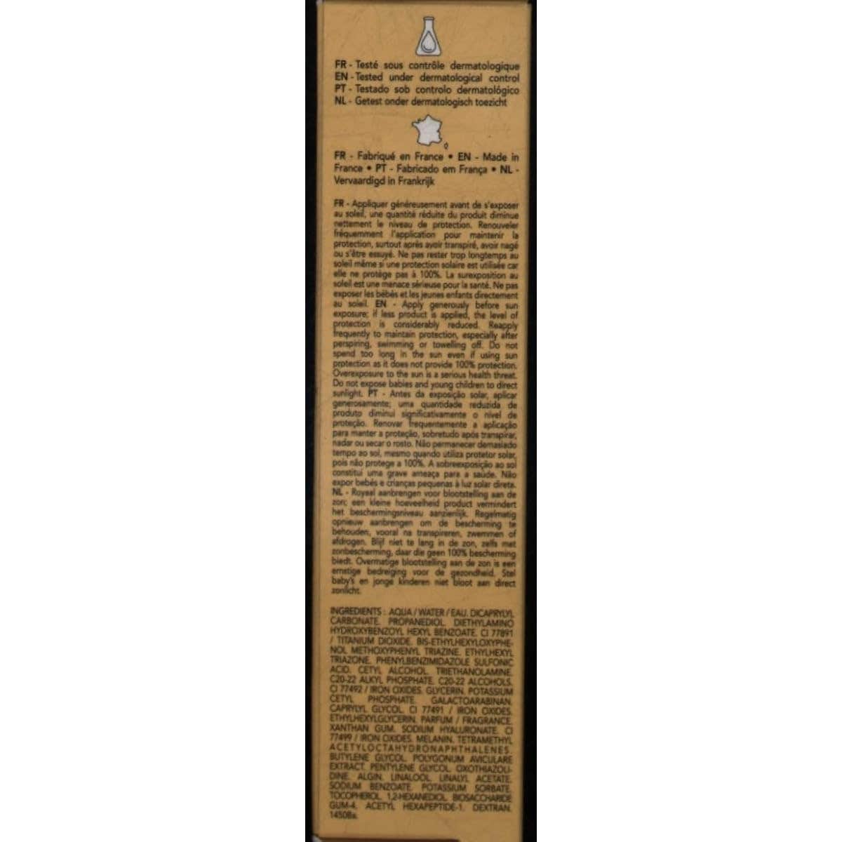 Esto permite una acción anti-edad global. Su fórmula también está enriquecida con extracto de alga roja, que realza el bronceado y deja un tono naturalmente luminoso. Su textura fluida ligera, con un acabado aterciopelado invisible, se funde en la piel sin dejar marcas blancas.