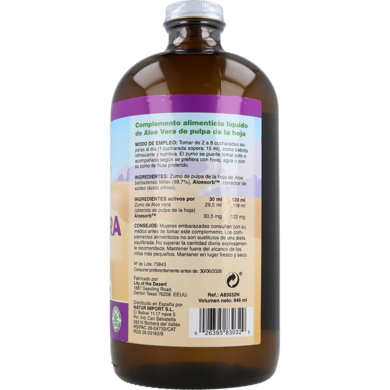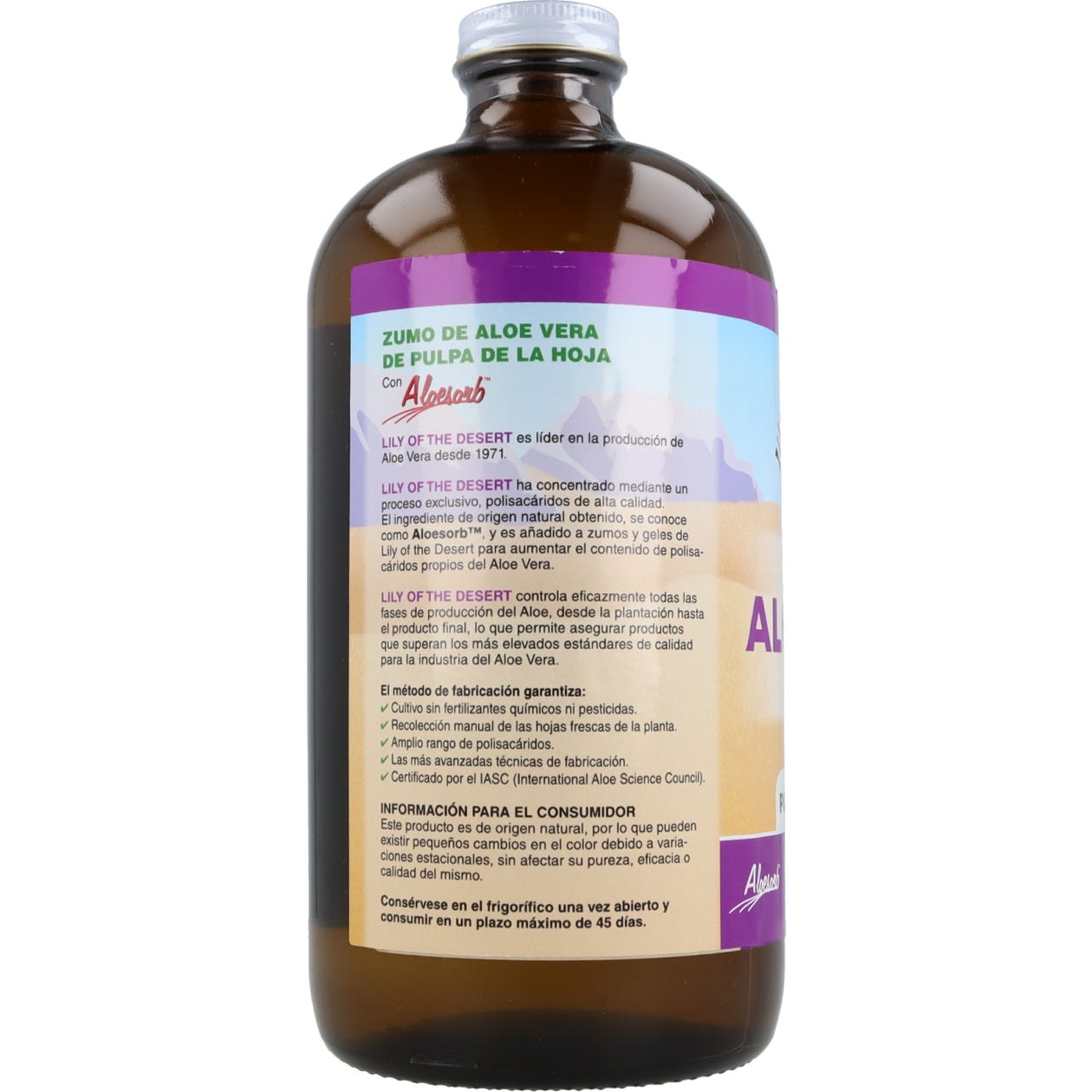 Lily Of The Desert Aloe Vera Pulpa Hoja Vidrio 946ml es un complemento alimenticio elaborada a base de la pulpa de aloe vera y contiene polisacáridos y ácidos orgánicos, como el ácido málico.