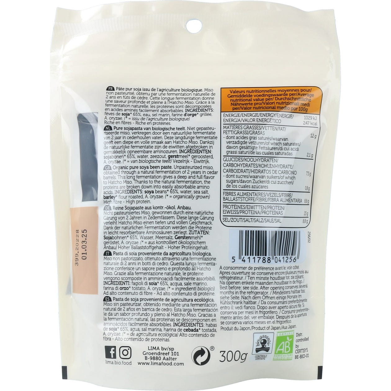 Pasta orgánica de la cocina tradicional japonesa. El hatcho miso es una pasta de soja fermentada, conocida hace más de 1.300 años en Oriente, utilizada para condimentar comidas. Recomendada para combinar con frijoles, arroz, salsas, platos horneados, sopas y guisos de verduras. Tiene un alto contenido de proteínas de origen vegetal. Elaborado con granos orgánicos de soja, agua, sal marina y harina de cebada, procedentes de cultivos ecológicos. Alimento vegano.