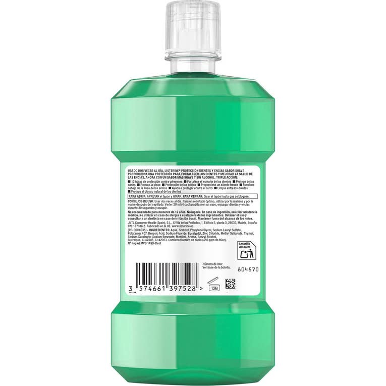 Listerine Protección Dientes y Encías Colutorio 750 ml es un producto diseñado para asegurar una higiene bucodental completa. Aunque el cepillado es fundamental, este colutorio complementa la limpieza al atacar las áreas de difícil acceso, logrando eliminar hasta un 97% de las bacterias presentes en la boca cuando se utiliza dos veces al día.