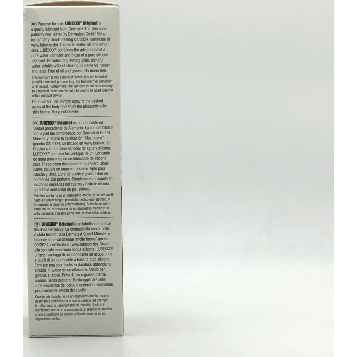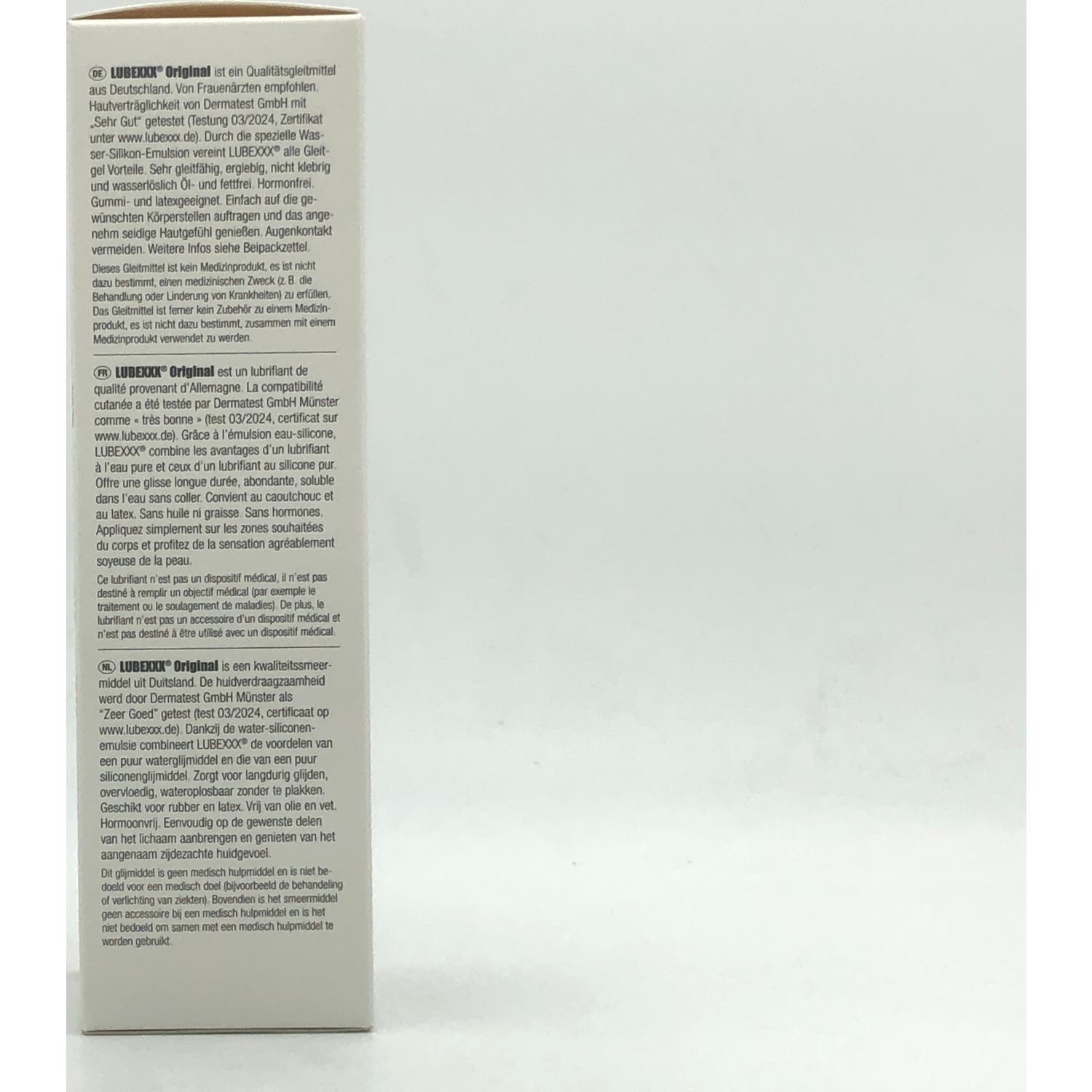 LUBEXXX® Lubricante Original - recomendado por ginecólogos. LUBEXXX® Original es un lubricante de alta calidad recomendado por ginecólogos con un tacto agradable y sedoso en la piel. Se utiliza cuando se desea un efecto deslizante adicional. El lubricante LUBEXXX® Original es un lubricante disponible en farmacias a base de una emulsión especial de agua y silicona (formulación 2 en 1) y reúne así todas las ventajas que debe tener un lubricante. Propiedades deslizantes, duraderas, solubles en agua y no pegajosas.
