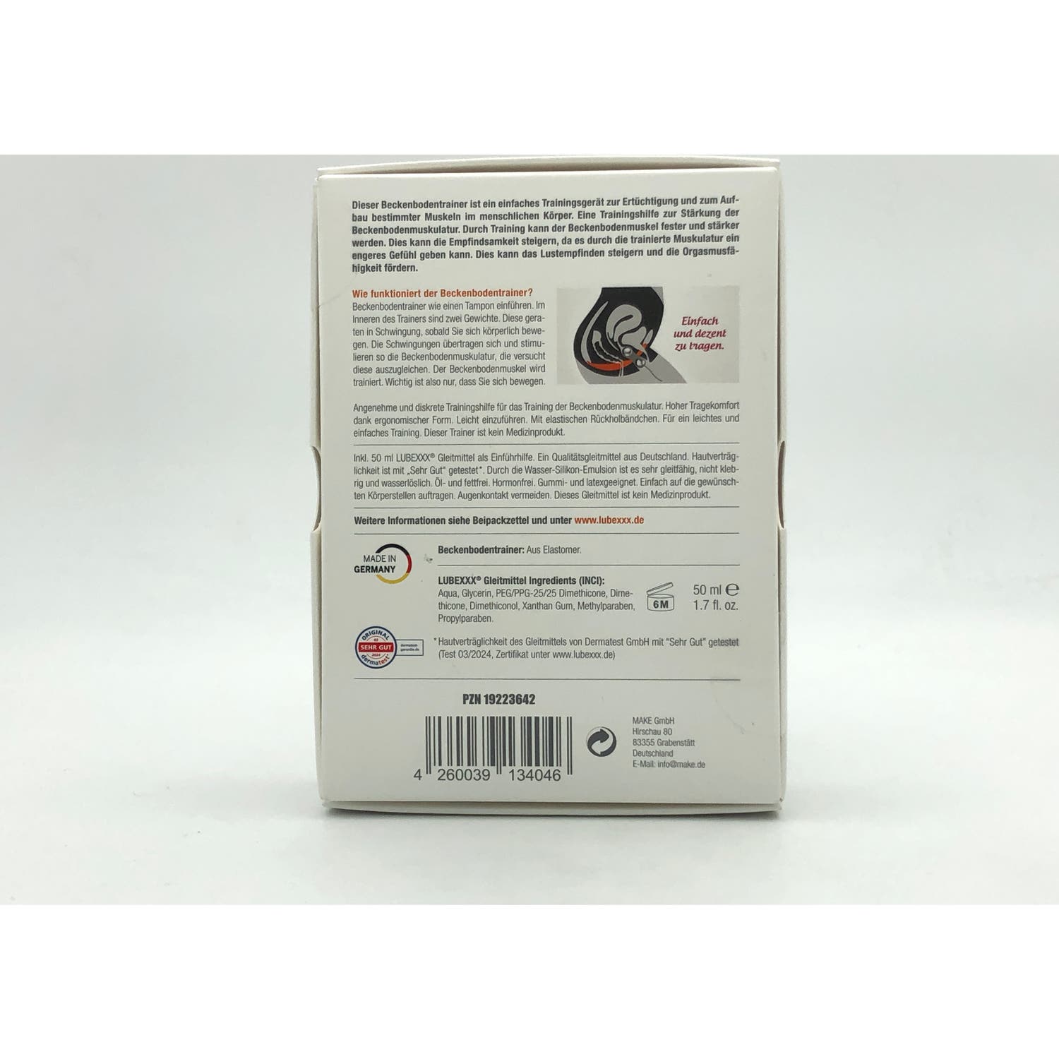 Unidad de embalaje - incluida en el set: Dispositivo de entrenamiento con un peso de aprox. 60g. 50ml LUBEXXX Lubricante original como ayuda adicional para la inserción. Prospecto.