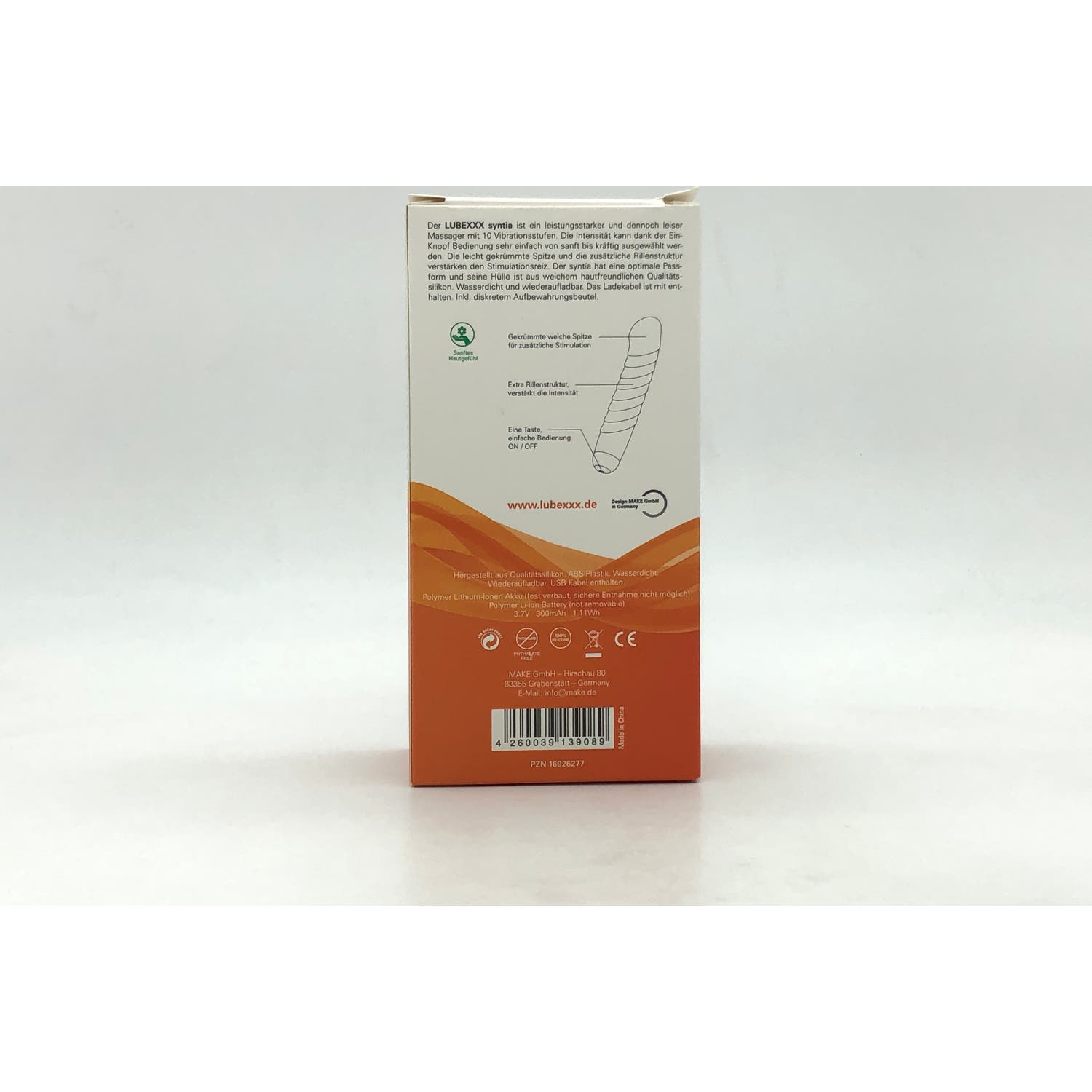 Las ventajas de su producto LUBEXXX syntia: Vibrador potente y silencioso. Con 10 emocionantes niveles de vibración. Estructura de ranuras adicional en el eje. Punta curva para estimulación del punto G. Silicona de alta calidad. Resistente al agua. Muy fácil de usar. Incluye muestra de lubricante original LUBEXXX. Incluye bolsa de almacenamiento higiénica. Incluye cable de carga USB.