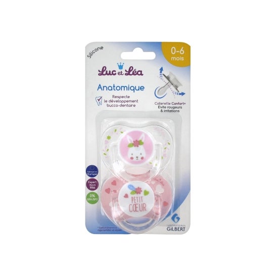 Son dos chupetes que han sido desarrollados para el confort y la seguridad de los bebés. Responden a la necesidad de succión natural e innata del bebé ayudándole así a sentirse seguro y tranquilo. El exclusivo escudo curvo y con orificios de ventilación evita las irritaciones y las rojeces que provoca el contacto prolongado de la saliva con la piel. La tetina de silicona ha sido diseñada por expertos y se adapta perfectamente al paladar de los bebés respetando así el desarrollo armonioso de las encías y de los dientes. *El color y diseño del producto pueden variar según la disponibilidad.