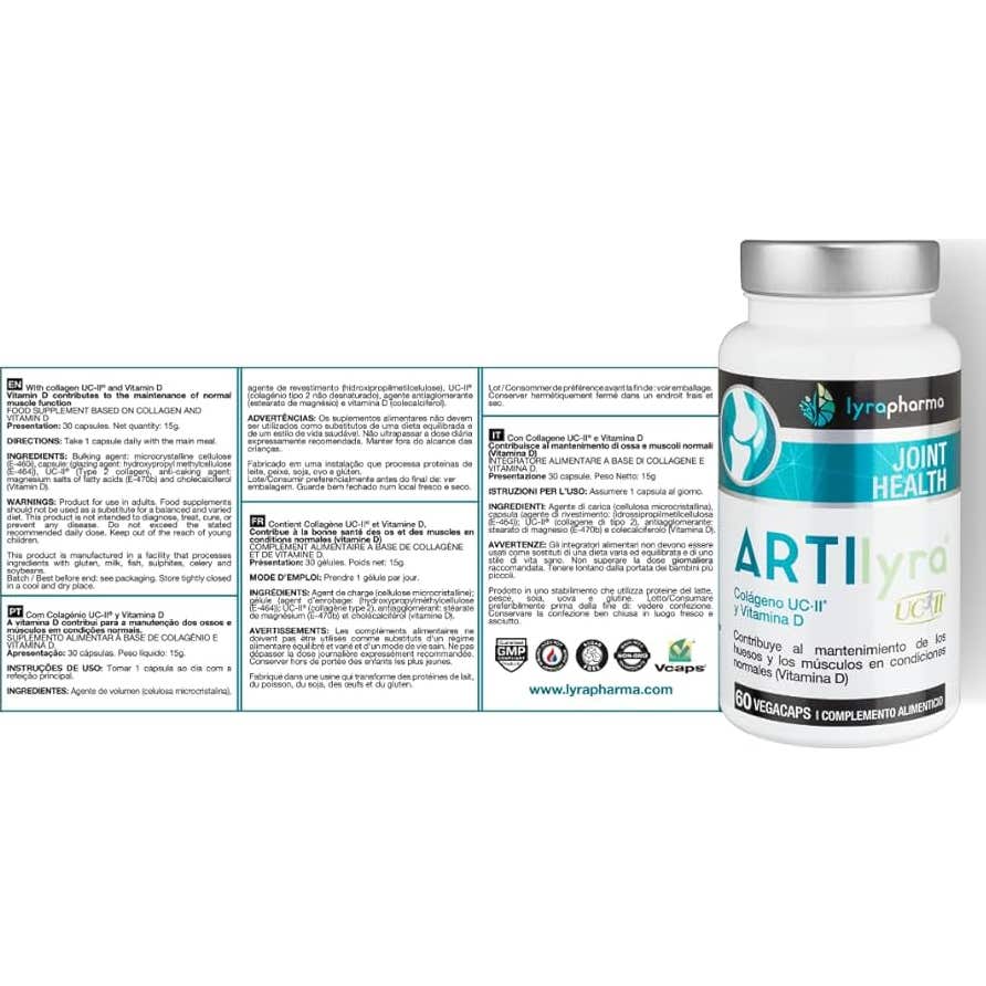 Lyrapharma Artilyra 30caps es un complemento alimenticio a base de colágeno y vitamina D. Ayuda a mantener los músculos en condiciones normales y a ofrecer apoyo a la salud articular. Además, contribuye a mejorar la absorción de calcio y así facilitar una mejor salud ósea. Contiene 30 cápsulas.