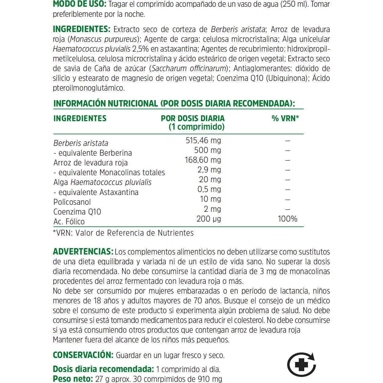 Complemento alimenticio a base de berberis aristata, arroz rojo, policosanol, coenzima q10 y astaxantina, todos ellos combinados para ayudar a controlar y regular los niveles de colesterol y triglicéridos en sangre, siendo de gran ayuda para cuidar y ayudar a mantener sano el sistema cardiovascular, mejorando también la producción de energía a nivel celular, ayudando a aumentar la vitalidad, energía y favorecer la correcta función de músculos y del sistema cardiovascular.