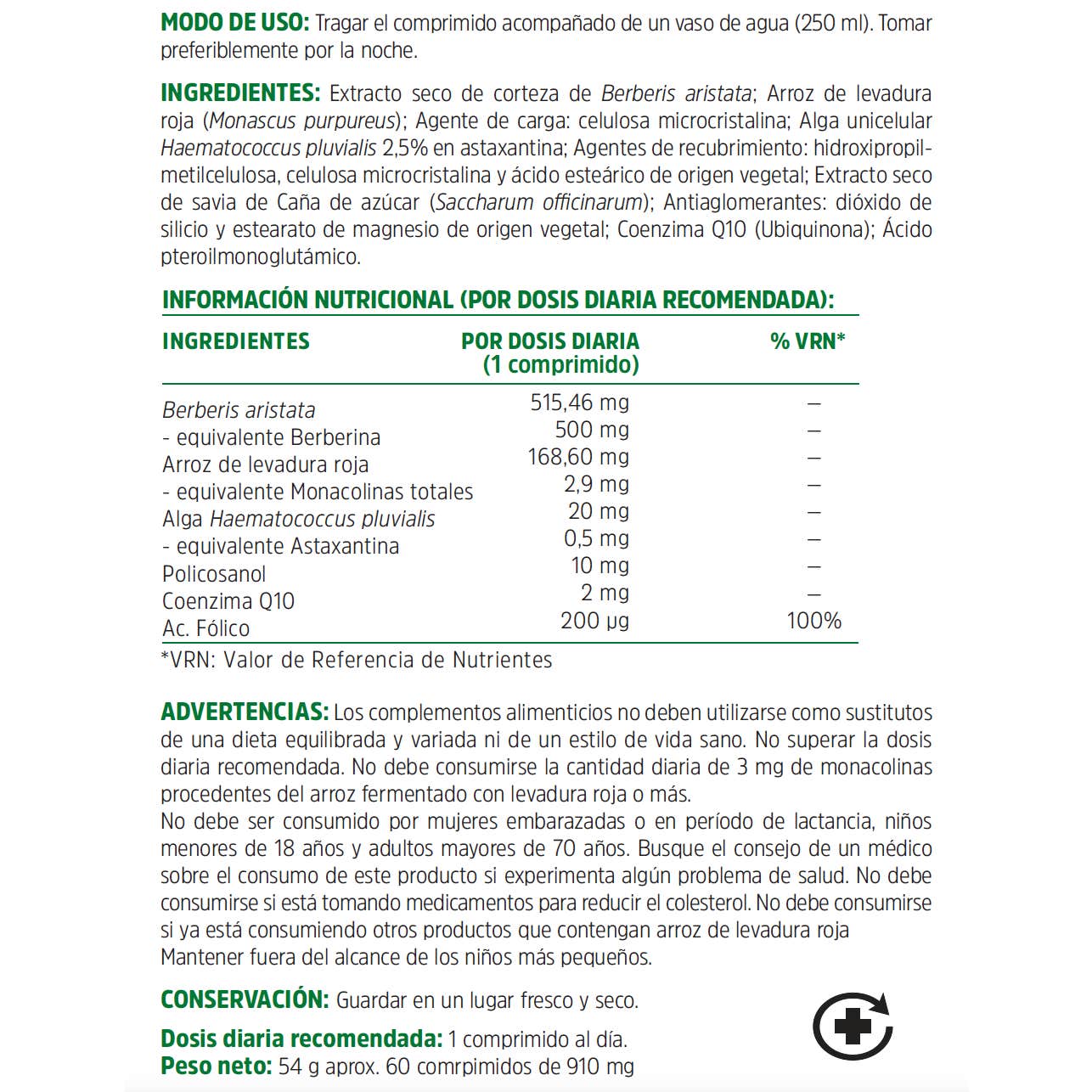 Contiene berberina, que da soporte al mantenimiento de los niveles normales de colesterol. Además de levadura de arrroz rojo, astaxantina, policosanol, coenzima Q10 y ácido fólico.