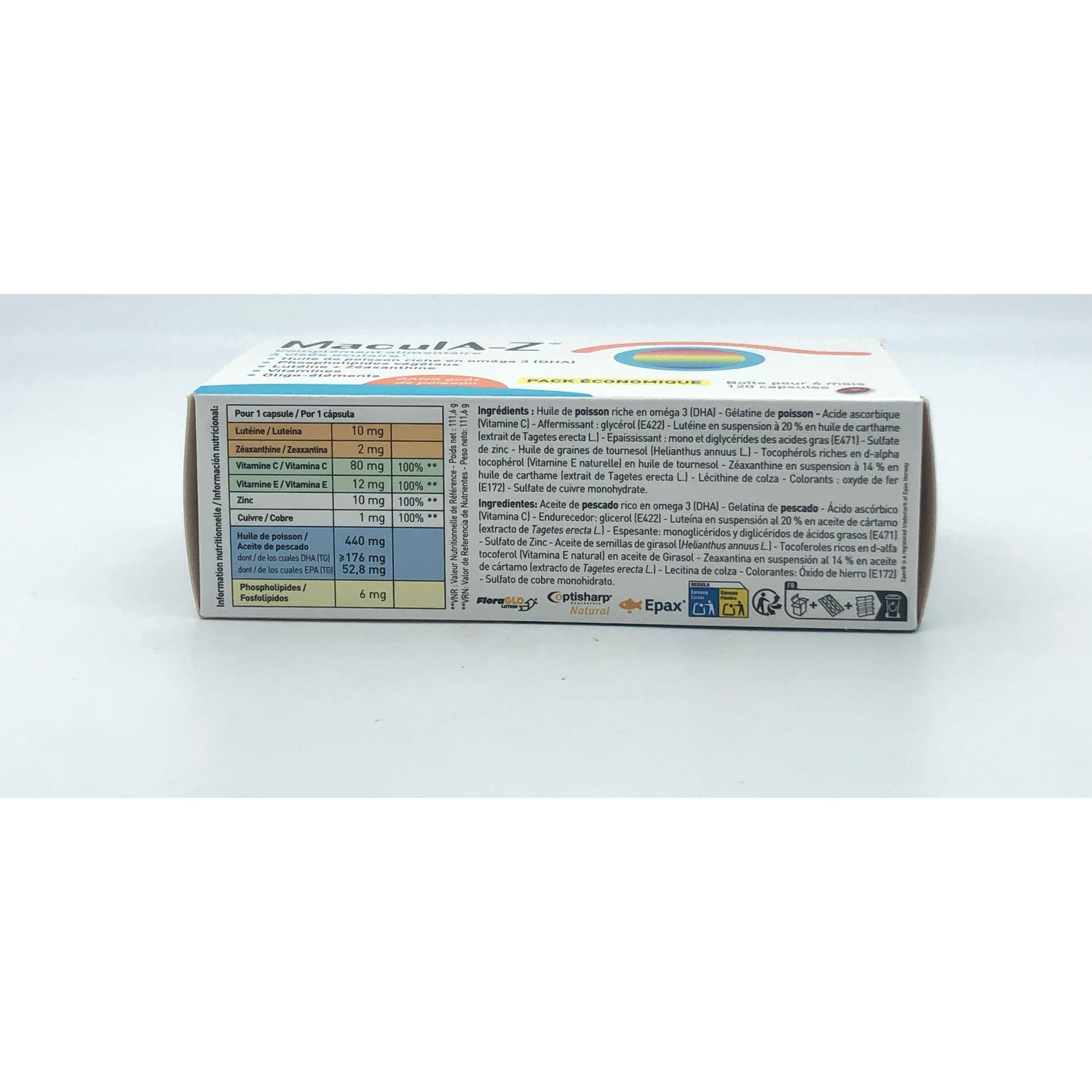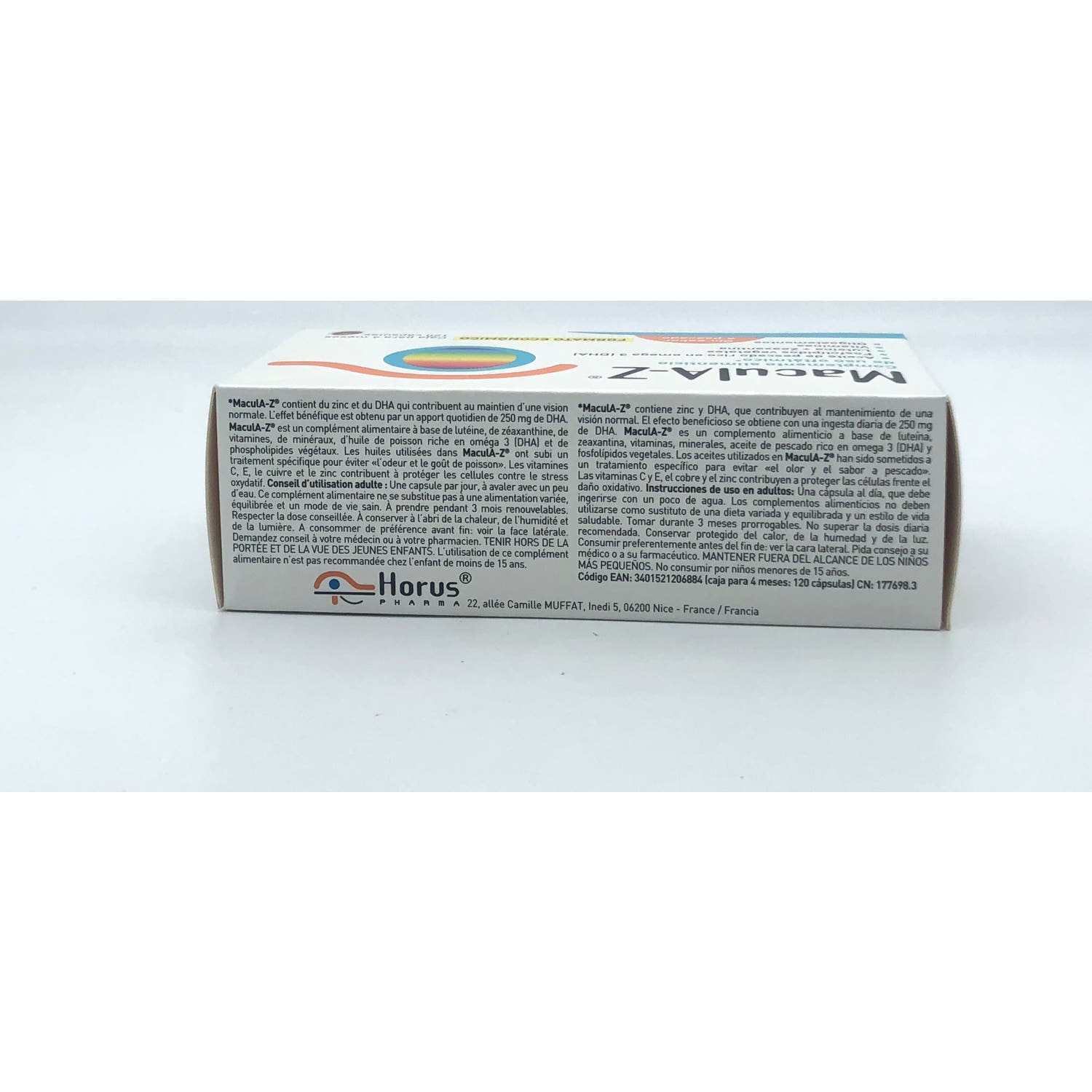 Macula Z 120Cáps es un complemento alimenticio con luteína que contribuye al mantenimiento de una visión normal. También contiene zinc, DHA, cobre y vitaminas C y E.