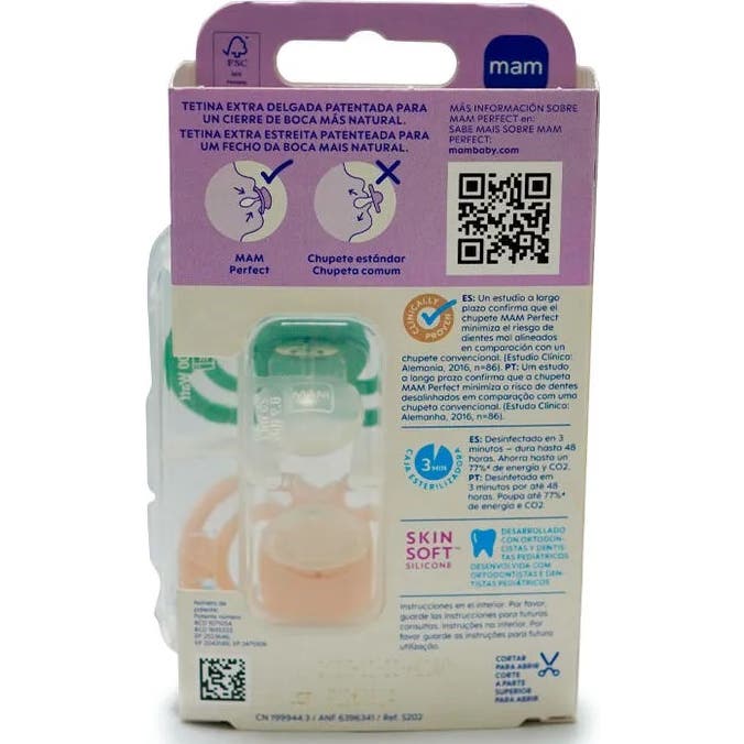 Mam Perfect Mate N Pack Chupete Silicona Simétrico +16M incluye 2 chupetes ortodónticos MAM con tetina simétrica de silicona SkinSoft™ mate, indicados para bebés a partir de 16 meses. Su diseño, desarrollado con dentistas pediátricos, apoya el cierre natural de la boca y ayuda a reducir el riesgo de maloclusiones dentales.