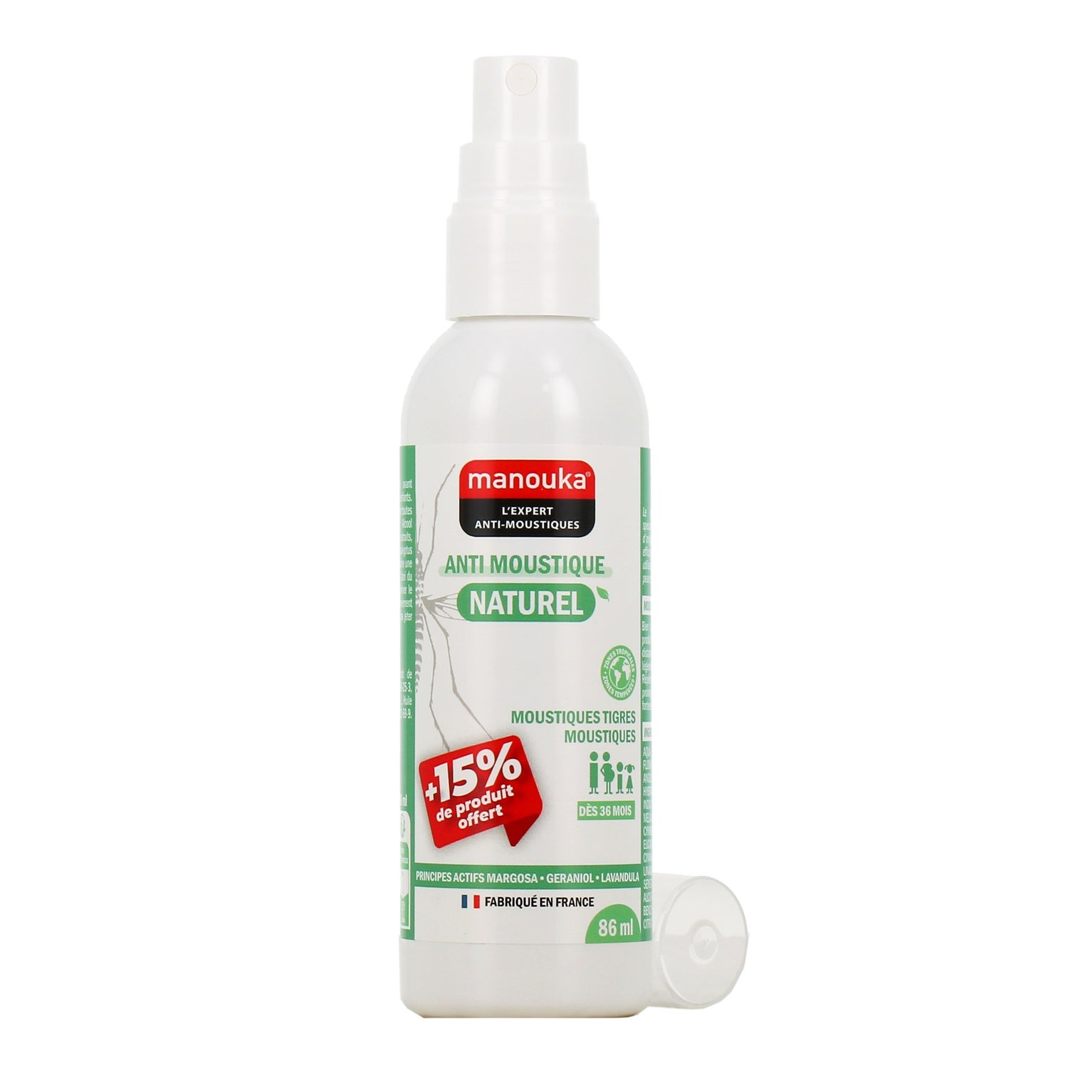 Manouka Anti-Mosquitos Natural Spray de 86 ml es una solución eficaz para repeler mosquitos, elaborada con ingredientes de origen natural y vegetal, apta para toda la familia. Este producto, fabricado en Francia, es efectivo contra: