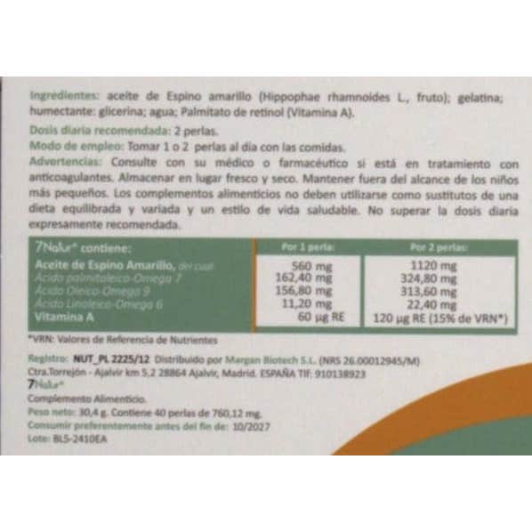 Aceite de Espino amarillo ( Hippophae rhamnoides) alta concentración en Omegas 6-7 9 ,: Perla ( Gelatina, Glicerina y agua) y Palmitato de retinilo.