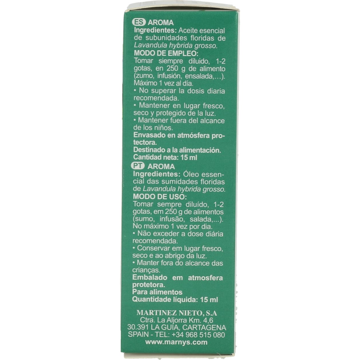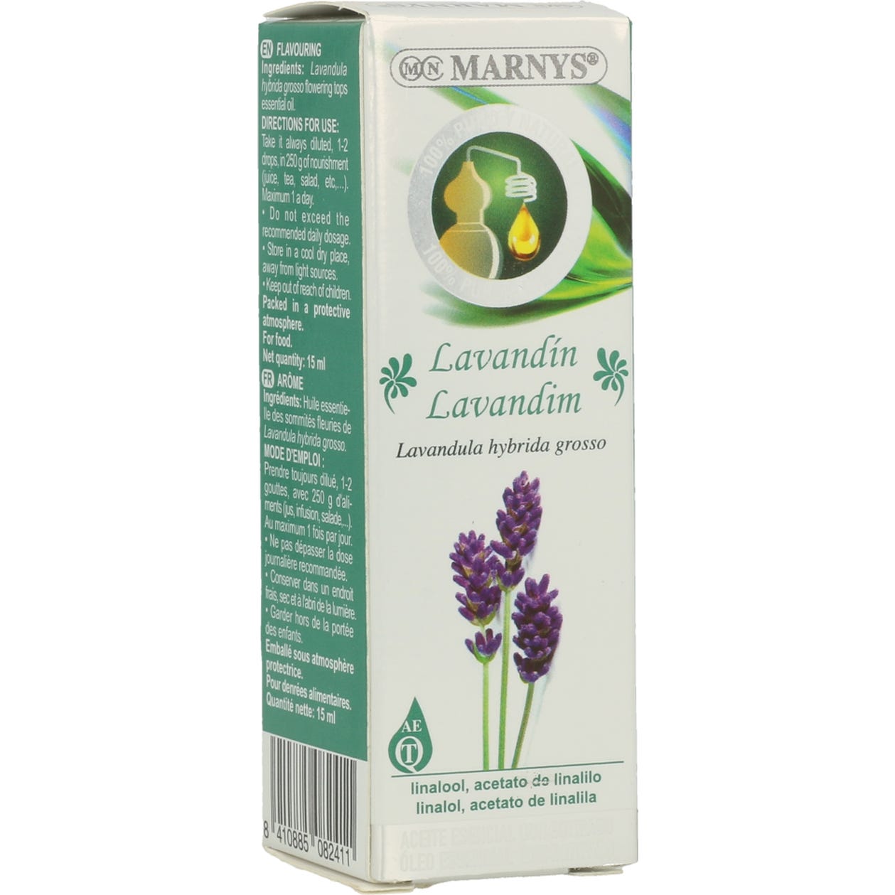 El aceite esencial de lavandín es un complemento para comidas y bebidas 100% puro y de origen natural, proveniente del arbusto Lavandula hybrida presente en España. Se obtiene por destilación por arrastre de vapor de agua de las sumidades floridas y no ha sido mezclado con otros aceites, lo que asegura sus propiedades. Su color y apariencia es amarillo pálido a suave, con sabor penetrante y fresco. Generalmente, se utiliza como condimento de carnes, dulces, helados y bebidas.