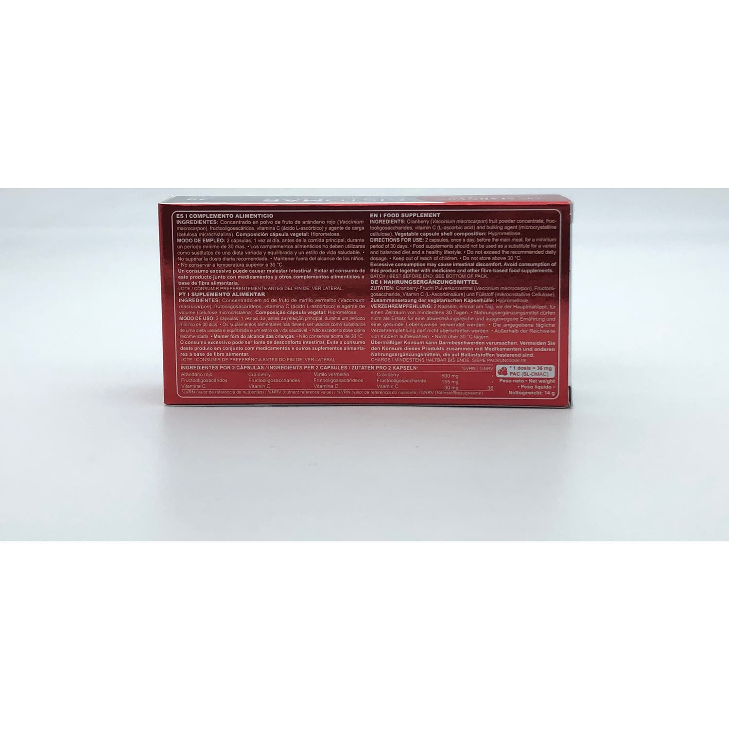 Concentrado en polvo de fruto de arándano rojo (Vaccinium macrocarpon), fructooligosacáridos, vitamina C y celulosa microcristalina. Composición cápsula vegetal: hipromelosa y dióxido de titanio.