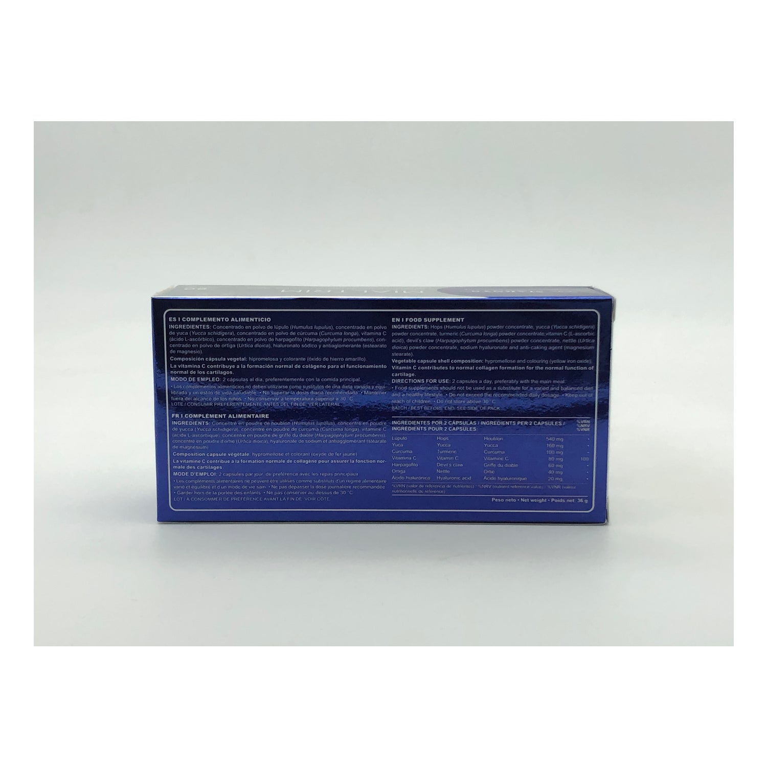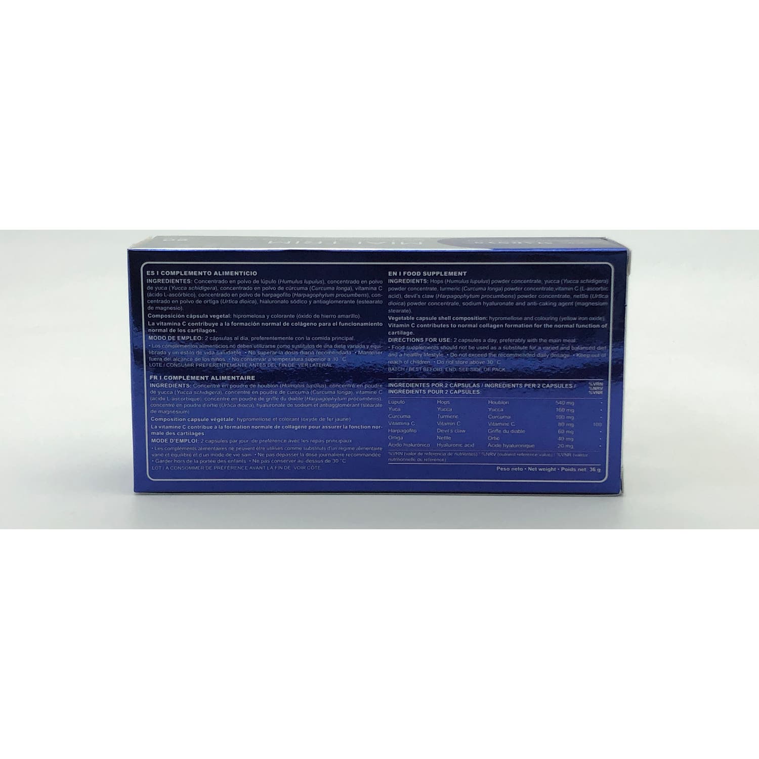 Su fórmula cuenta con Vitamina C, Cúrcuma, Harpagofito y Ortiga, Lúpulo, Yuca y Ácido Hialurónico, que aportan efecto antioxidante. favorecen la formación de colágeno, ayudan a reducir la inflamación muscular, alivian las molestias articulares y proporcionan flexibilidad a las articulares. Además, es apta para personas veganas e intolerantes al gluten.
