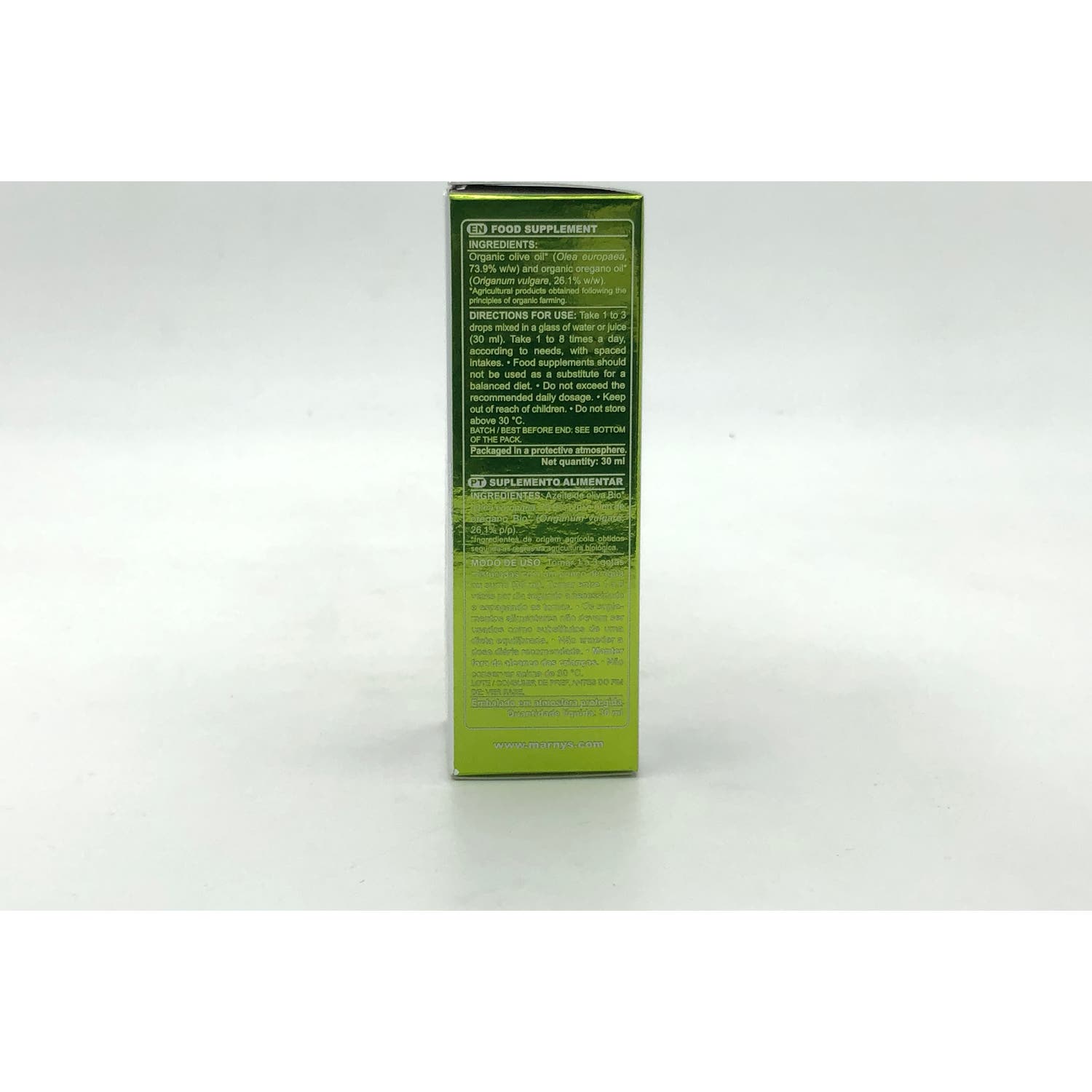 El Aceite de Orégano de Marnys es un producto elaborado con ingredientes de cultivo 100% ecológicos, garantizando su pureza y calidad. Está compuesto por aceite de orégano puro del Mediterráneo (Origanum minutiflorum), y destaca por su alto contenido en principios activos como el carvacrol y el timol, que cuentan con propiedades antisépticas y antibióticas.