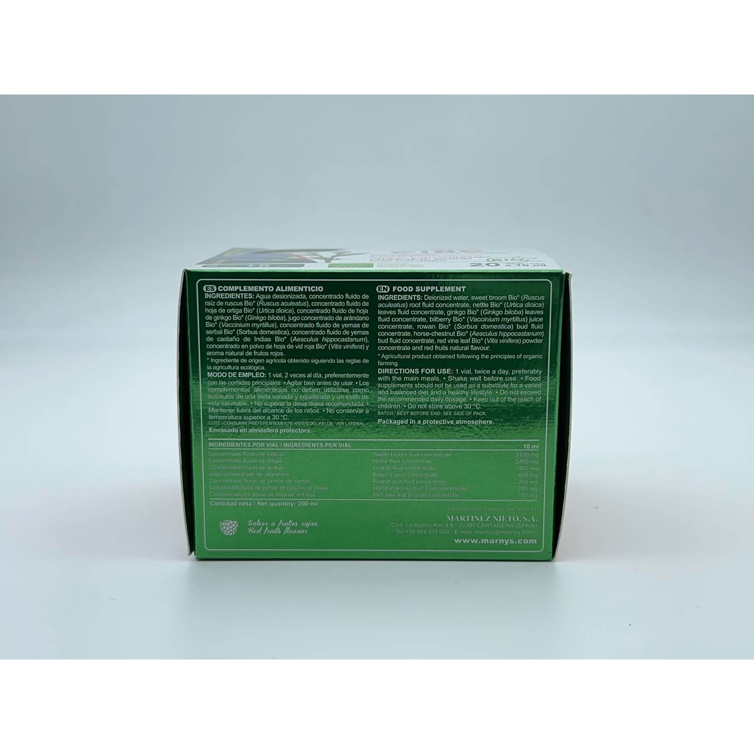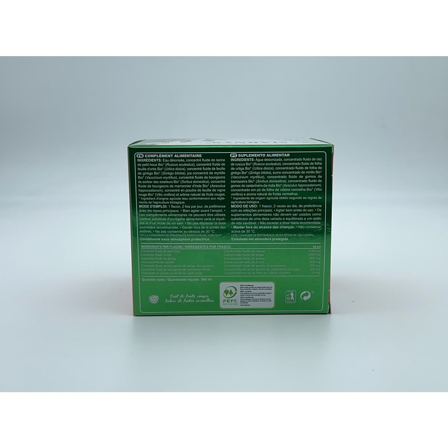 Complemento alimenticio con sabor a frutas del bosque, formulado a base de Ginkgo biloba, vid roja y arándano orgánico. Presentación en 20 viales bebibles.