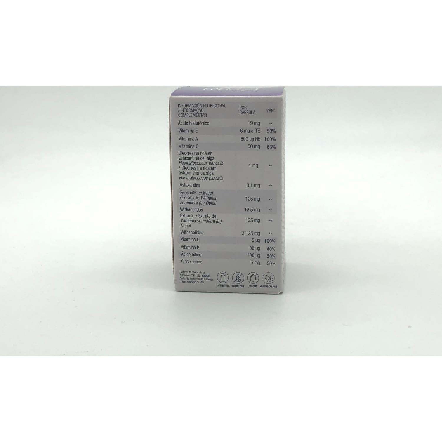 Ácido Hialurónico (Oral), Astaxantina (Oral), Vitamina A (Oral), Vitamina B9 – Ácido fólico (Oral), Vitamina C (Oral), Vitamina D (Oral), Vitamina E – Tocoferol (Oral), Vitamina K3 (Oral), Sensoril ®, Zinc.