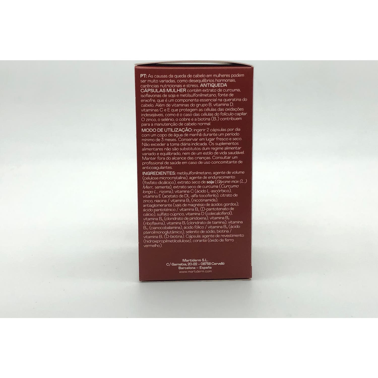 Martiderm Anticaída Cápsulas Mujer 120caps es un complemento alimenticio que contribuye a tratar y disminuir la caída, mientras promueve la nutrición y refuerzo del folículo piloso.