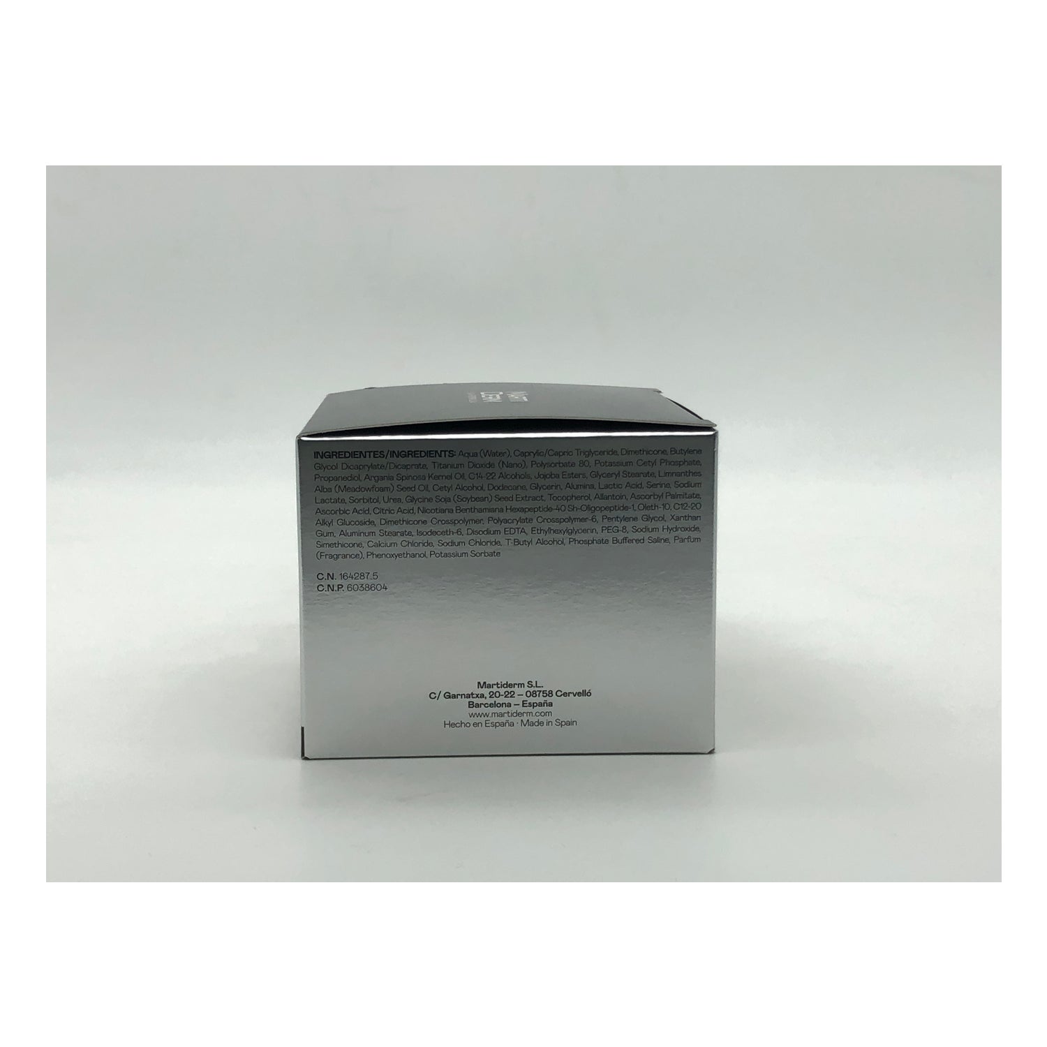 AQUA, TRIGLICÉRIDO CAPRÍLICO / CÁPRICO, MIRISTATO DE ISOPROPILO, ACEITE DE ARGANIA ESPINOS, ÉSTERES DE JOJOBA, ESTARATO DE PEG-6, ACEITE DE SEMILLA DE ALBA DE PRADERA (MEADWFOAM), PROPILENGLICOL, DIÓXIDO DE TITANIO (NANO), CICLOPENTASIOXANO, ALCOHOL C14-22, DODECANO , POLISORBATO 20, POLÍMERO CRUZADO DE CEILFOSFATO DE POTASIO-6, OLETH-10, ÉTER DE DICAPRILILO, DEMENTHICONA, HEXAPÉPTIDO DE NICOTIANA BENTHAMIANA-40 SH-OLIGOPÉPTIDO-1 / SOLUCIÓN SALINA TAMPONADA CON FOSFATO, ÁCIDO LÁCTICO, UREA, EXTRACTO DE SEMILLA DE SOJA DE GLICINA (SOJA), GLICERINA, CETETH-20, PERFUME, ALQUIL GLUCÓSIDO C12-20, ÁCIDO ESTEÁRICO, POLÍMERO CRUZADO DE DIMENTICONA, ESTEARATO DE GLICERILO, PENTILENGLICOL, BENZOATO DE SODIO STEARETH-20, PROTEÍNA CRUDA HIDROLIZADA / POLÍMERO CRUZADO PVP, ALÚMINA, ESTERATO DE ALUMINIO, ISODECETG-6, SORBATO DE POTASIO, SERINA , LACTATO, SORBITOL, FENOXIETANOL, SIMETICONA, CLORURO DE SODIO, ALANTOÍNA, TOCOFEROL.