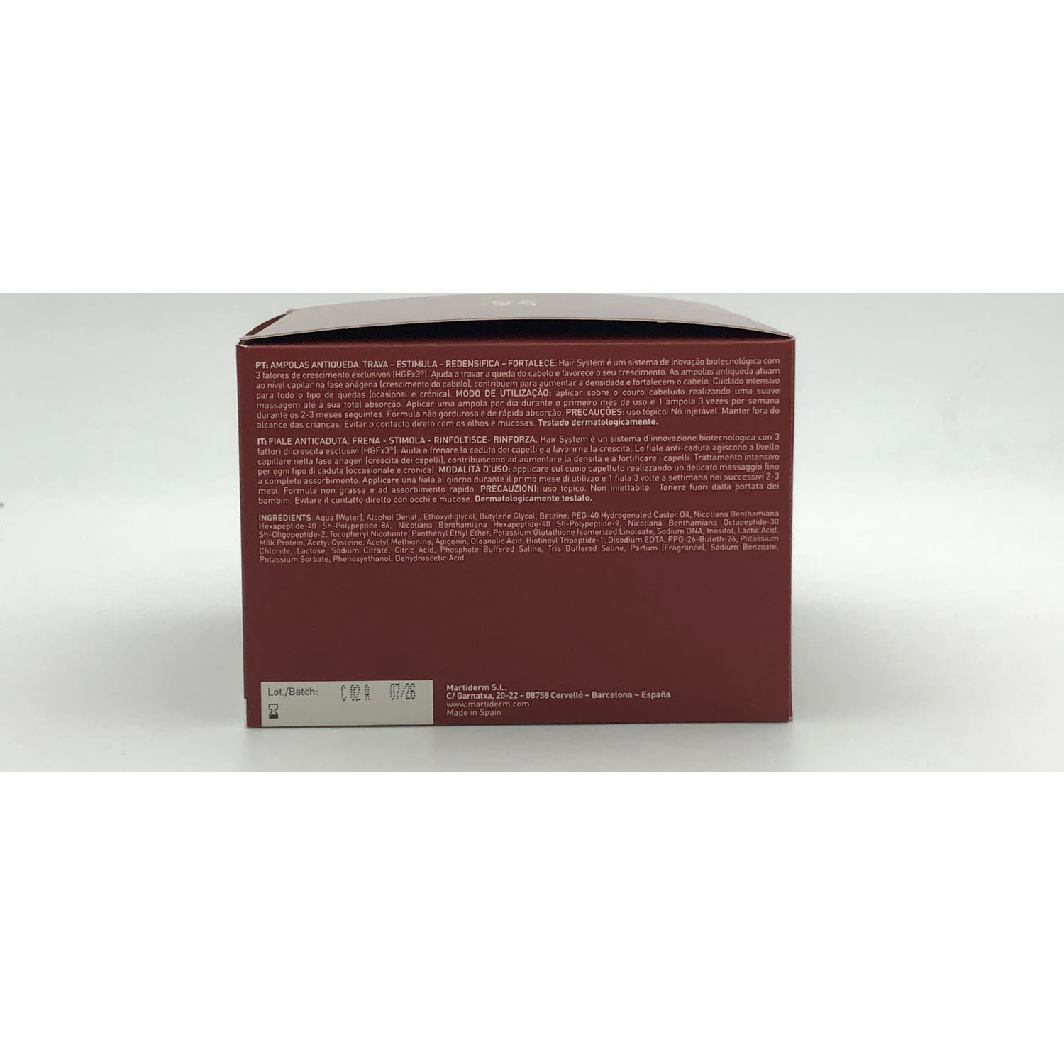 Martiderm Hair System Ampollas Anticaída 28amp es un tratamiento anticaída que ayuda a frenar, estimular el crecimiento y a redensificar y fortalecer el cabello. Indicado para todo tipo de caída, ocasional y crónica.