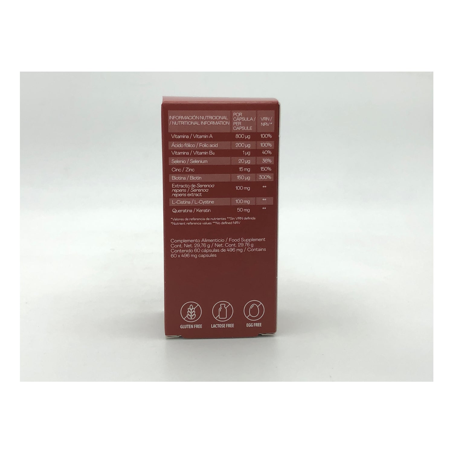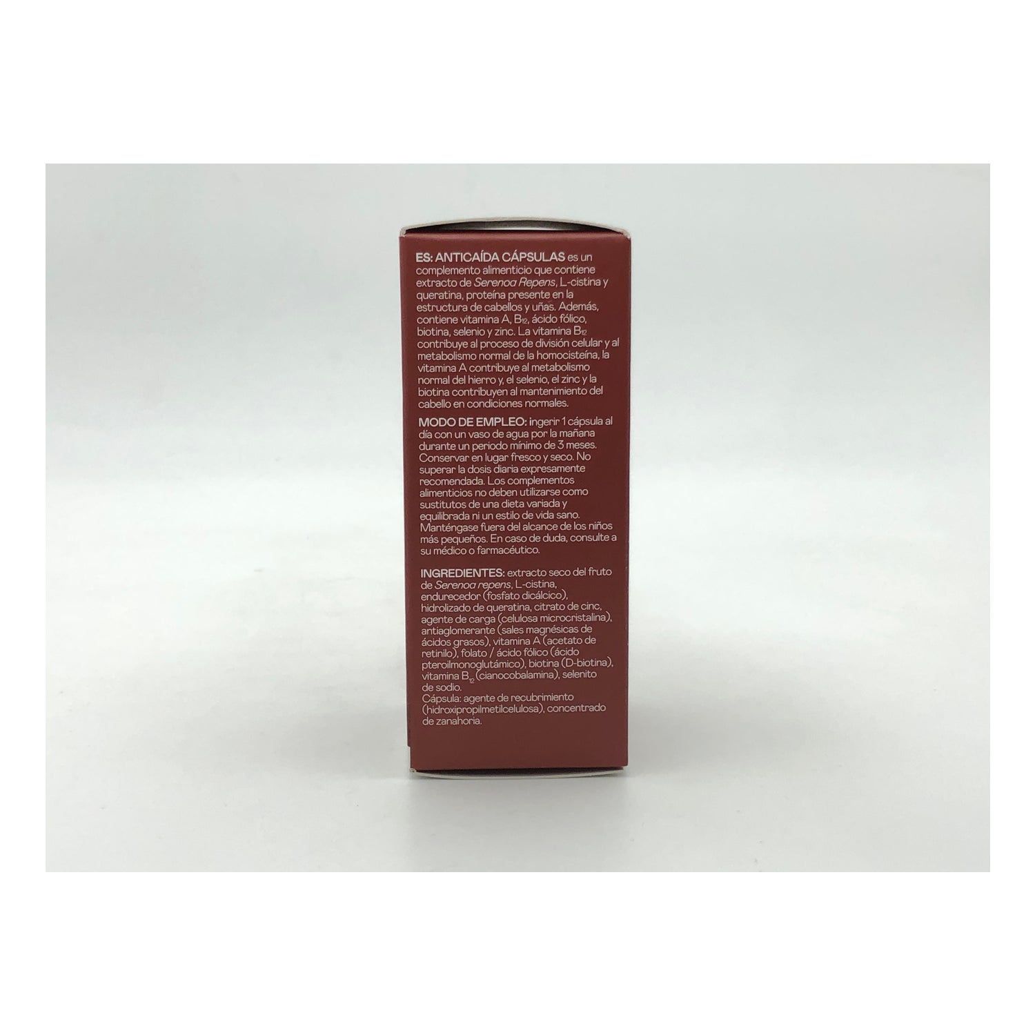 Extracto seco de fruto de Serenoa repens, L-cistina, agente de carga (celulosa microcristalina), hidrolizado de queratina, citrato de cinc, endurecedor (fosfato dicálcico), antiaglomerantes (sales magnésicas de ácidos grasos), vitamina A (acetato de retinilo), folato / ácido fólico (ácido pteroilmonoglutámico), biotina (D-biotina), vitamina B12 (cianocobalamina) y selenito de sodio.
