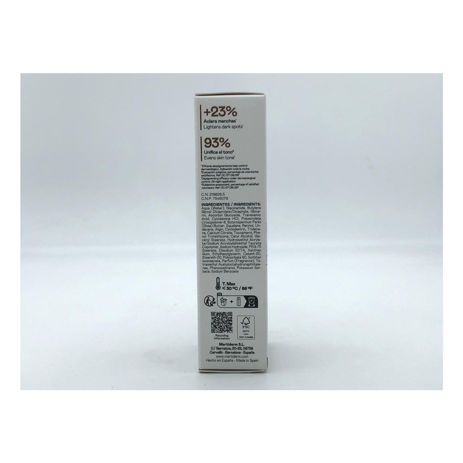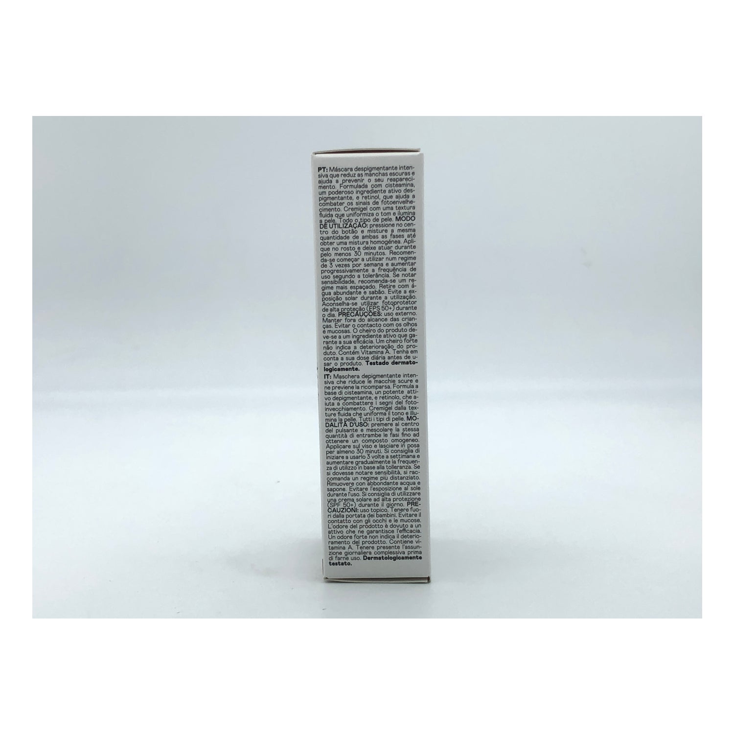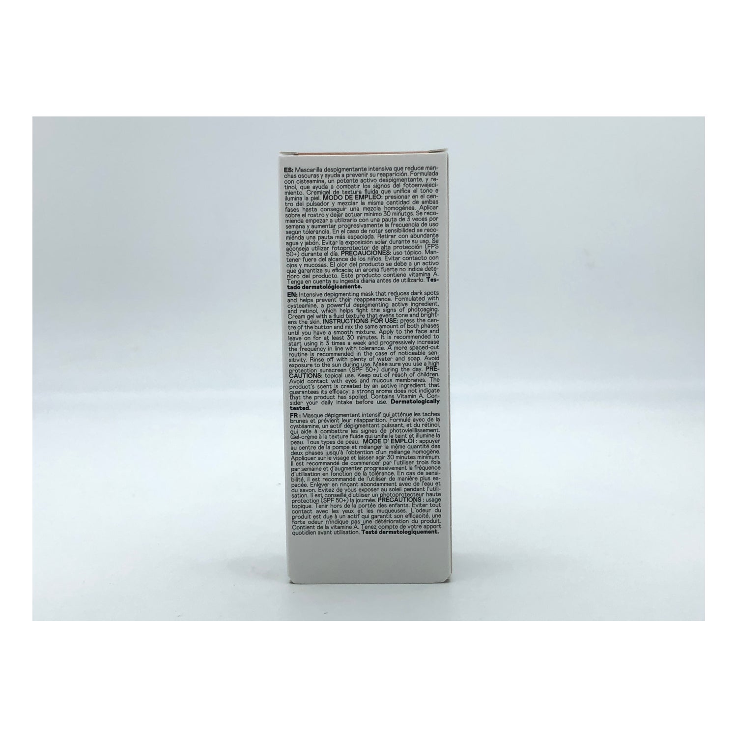 Formulada principalmente con cisteamina, un potente activo despigmentante, y retinol, que ayuda a combatir los signos del fotoenvejecimiento y reduce las líneas de expresión.