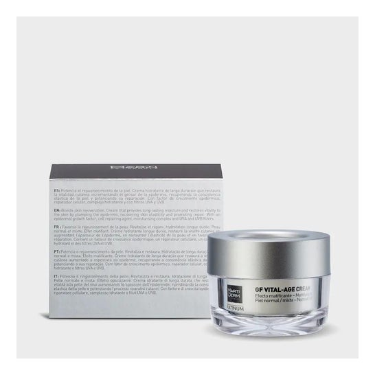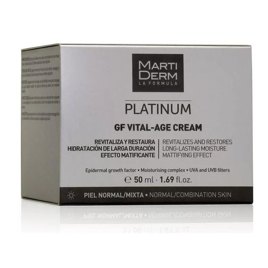 Martiderm® Platinum GF Vital Age Cream 50ml es una crema hidratante para reforzar y regenerar la vitalidad y elasticidad en las pieles normales y mixtas.