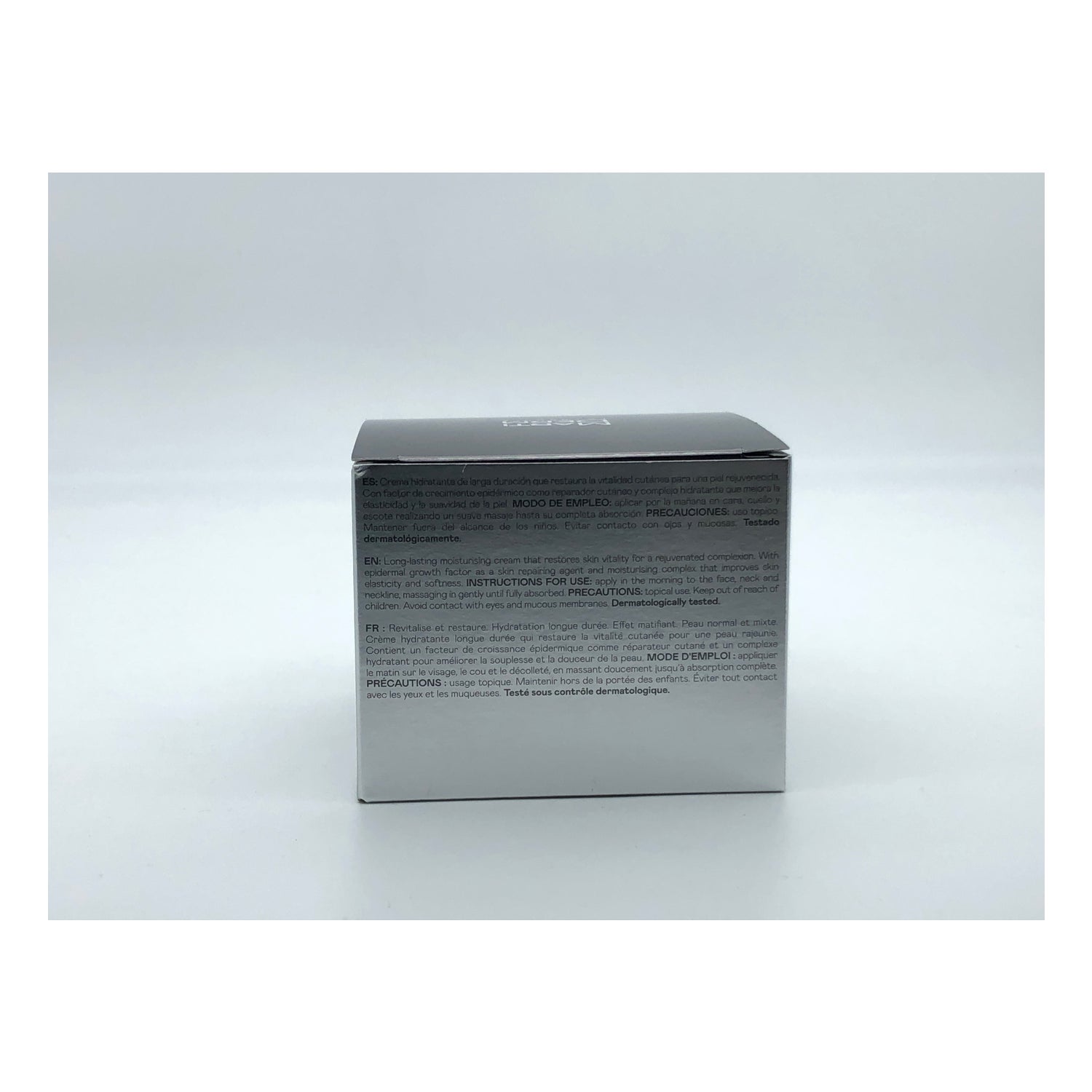 Formulado a base del factor de crecimiento epidérmico que es un oligopéptido obtenido de la planta Nicotiana Benthamiana que ayuda a reafirmar y rejuvenecer la dermis. Además, de un complejo hidratante ayuda las células a retener el agua, para combatir la deshidratación de la piel de manera natural.