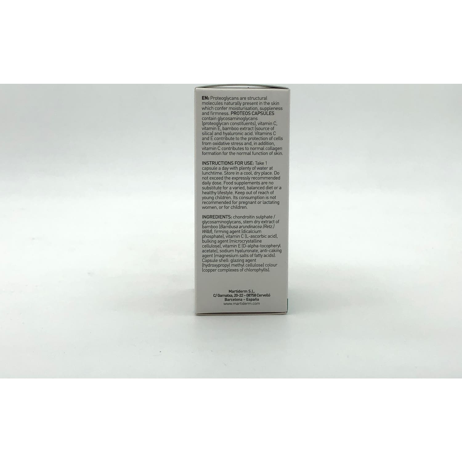 Martiderm Proteos 60cáps es un complemento alimenticio que ayuda a mejorar la hidratación y firmeza de la piel. Su formulación basada en glicosaminos de origen marino dan soporte a la hidratación de la piel, reteniendo el agua de los tejidos y manteniendo la juventud de la piel.