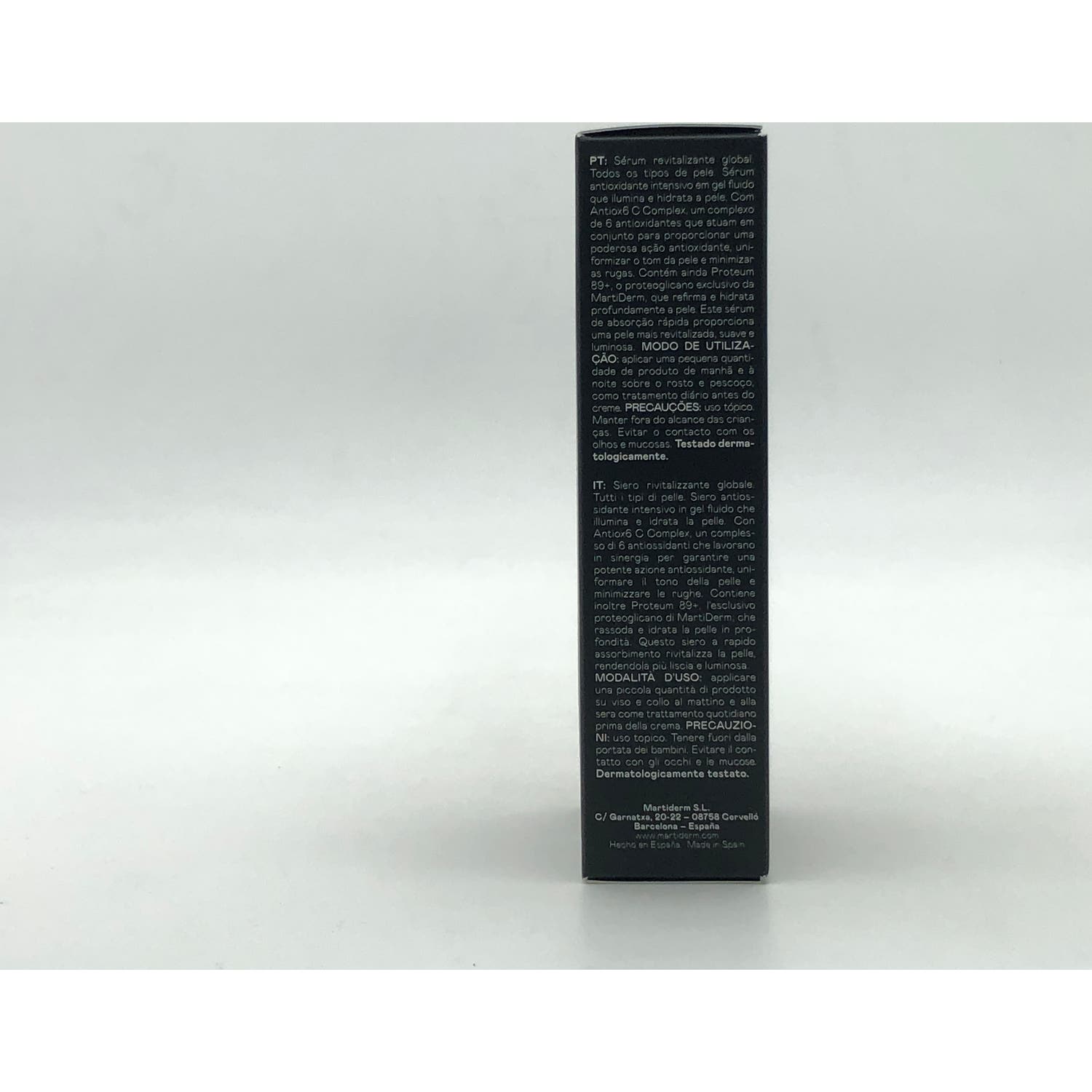 Sérum antioxidante intensivo en gel fluido que ilumina e hidrata la piel. Con Antiox6 C Complex, un complejo de 6 antioxidantes que actúan conjuntamente para ofrecer una potente acción antioxidante, unificar el tono de la piel y minimizar arrugas. Y también con Proteum 89+, el proteoglicano exclusivo de MartiDerm, que reafirma e hidrata la piel en profundidad. Este sérum de absorción rápida proporciona una piel más revitalizada, lisa y luminosa.