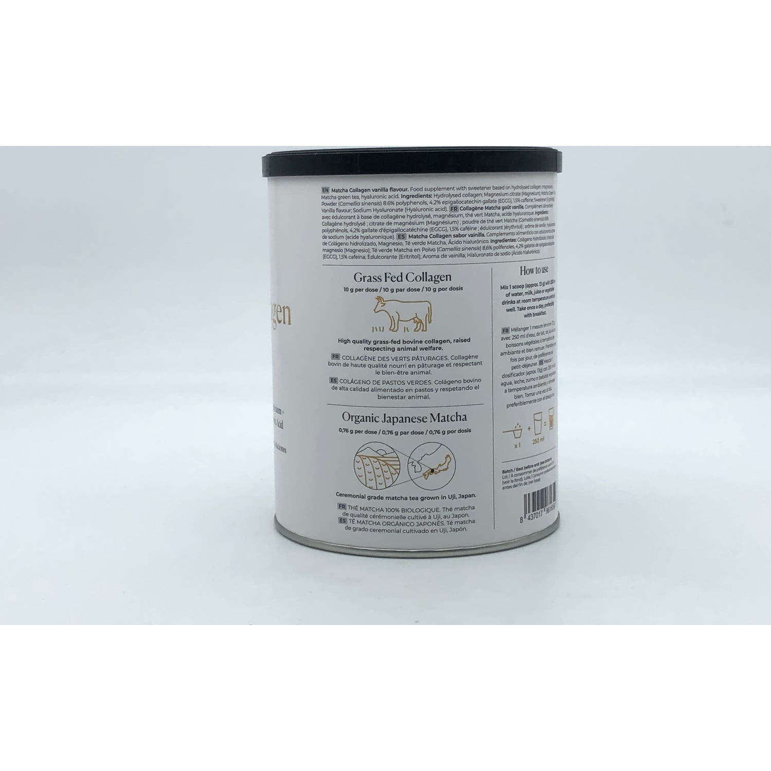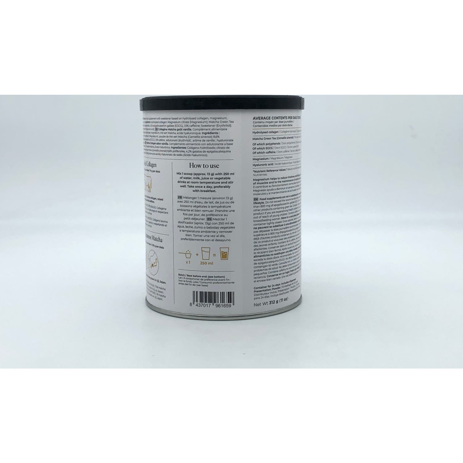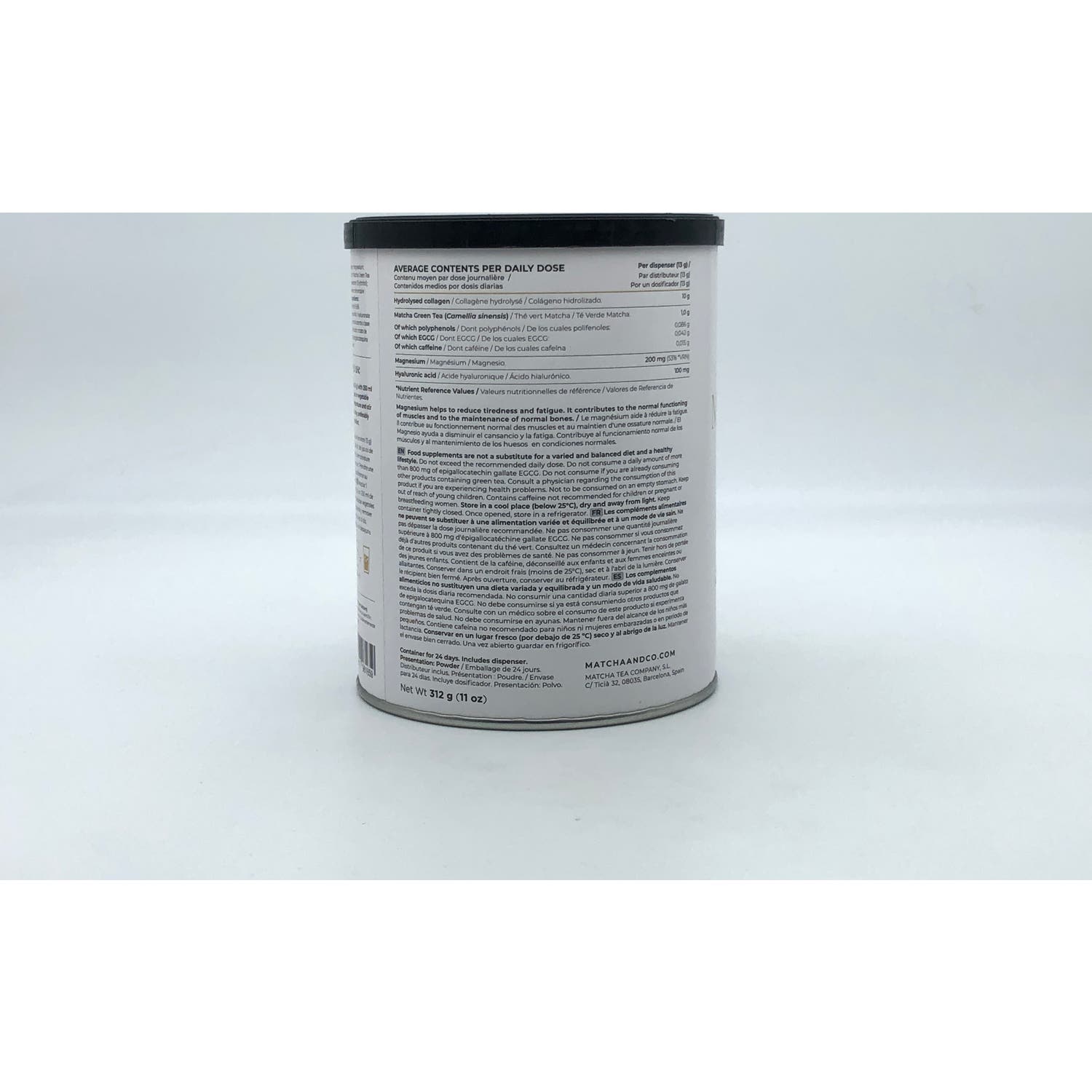 Matcha Colágeno (Sabor Matcha): 80% Péptidos de Colágeno Hidrolizado (origen bovino), 11.03% Citrato de Magnesio, 8.12% Té Matcha Orgánico, Hialuronato de Sodio (Ácido Hialurónico). Matcha Colágeno (Sabor Vainilla): 76% Péptidos de Colágeno Hidrolizado (origen bovino), 10.60% Citrato de Magnesio, 7.69% Té Matcha Orgánico, Eritritol, Sabor Vainilla, Hialuronato de Sodio (Ácido Hialurónico).