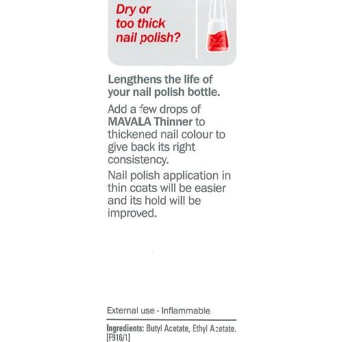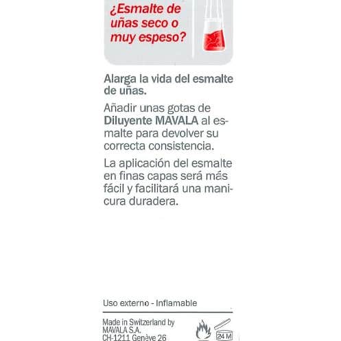 Mavala diluyente es un remedio eficaz para lograr alargar la vida del esmalte, haciendo que sea más fluido y resistente. Gracias a la mezcla de sus disolventes logra conseguir que tus uñas queden intactas durante más tiempo.