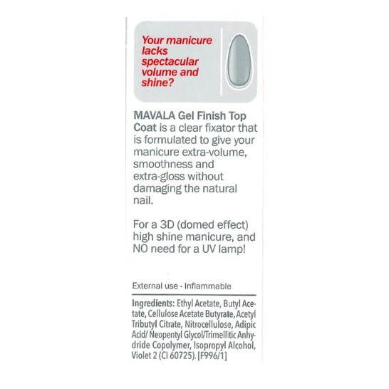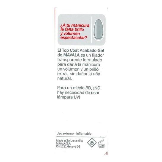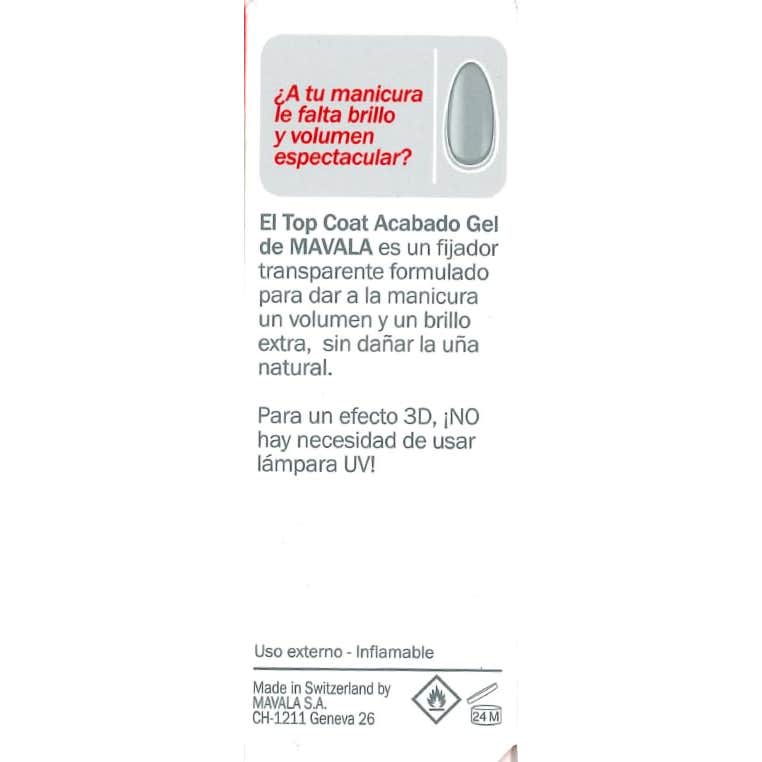 Mavala Top Coat acabado gel es un tratamiento fijador transparente que creará una capa externa brillante y lisa para tus uñas con la que resaltarás tu belleza.