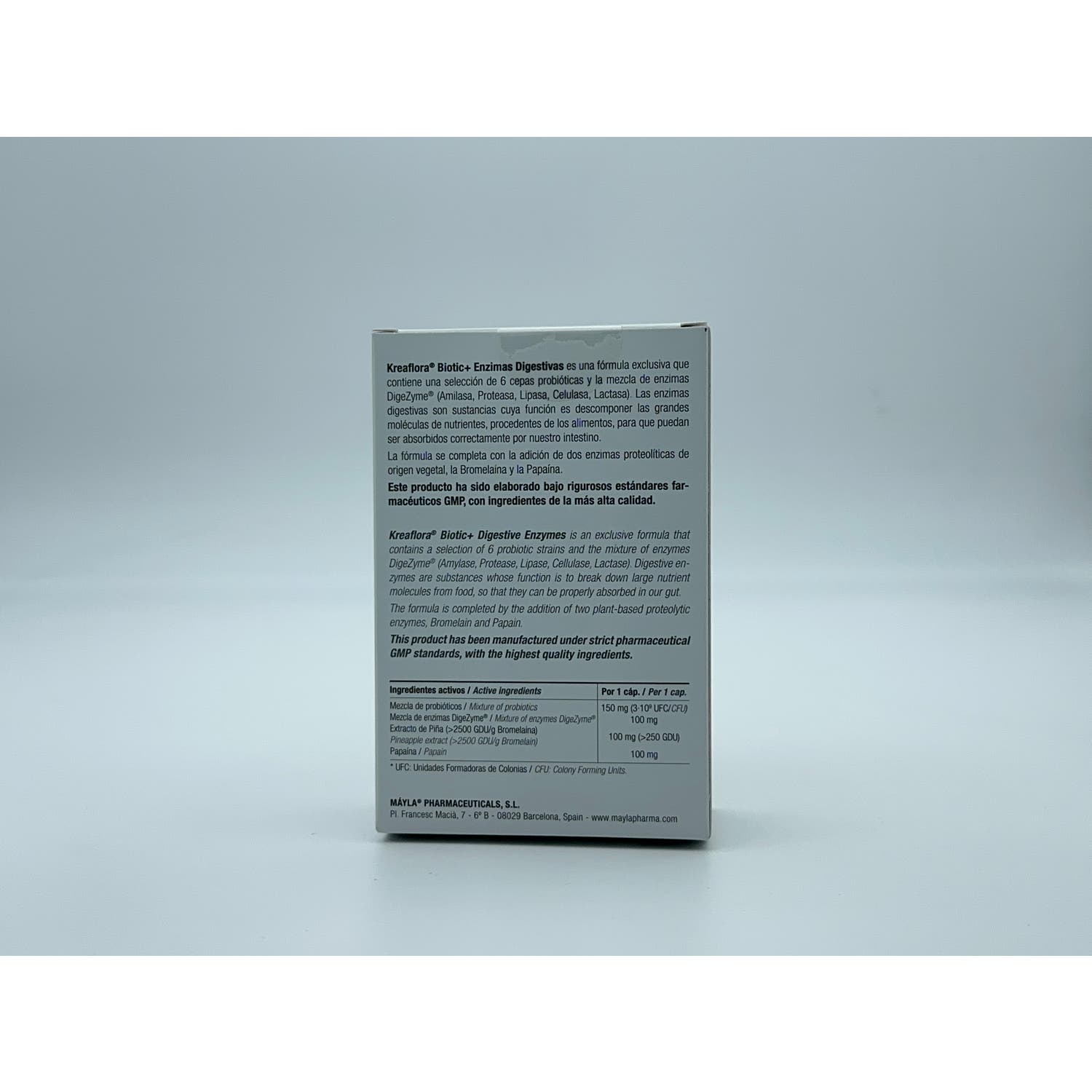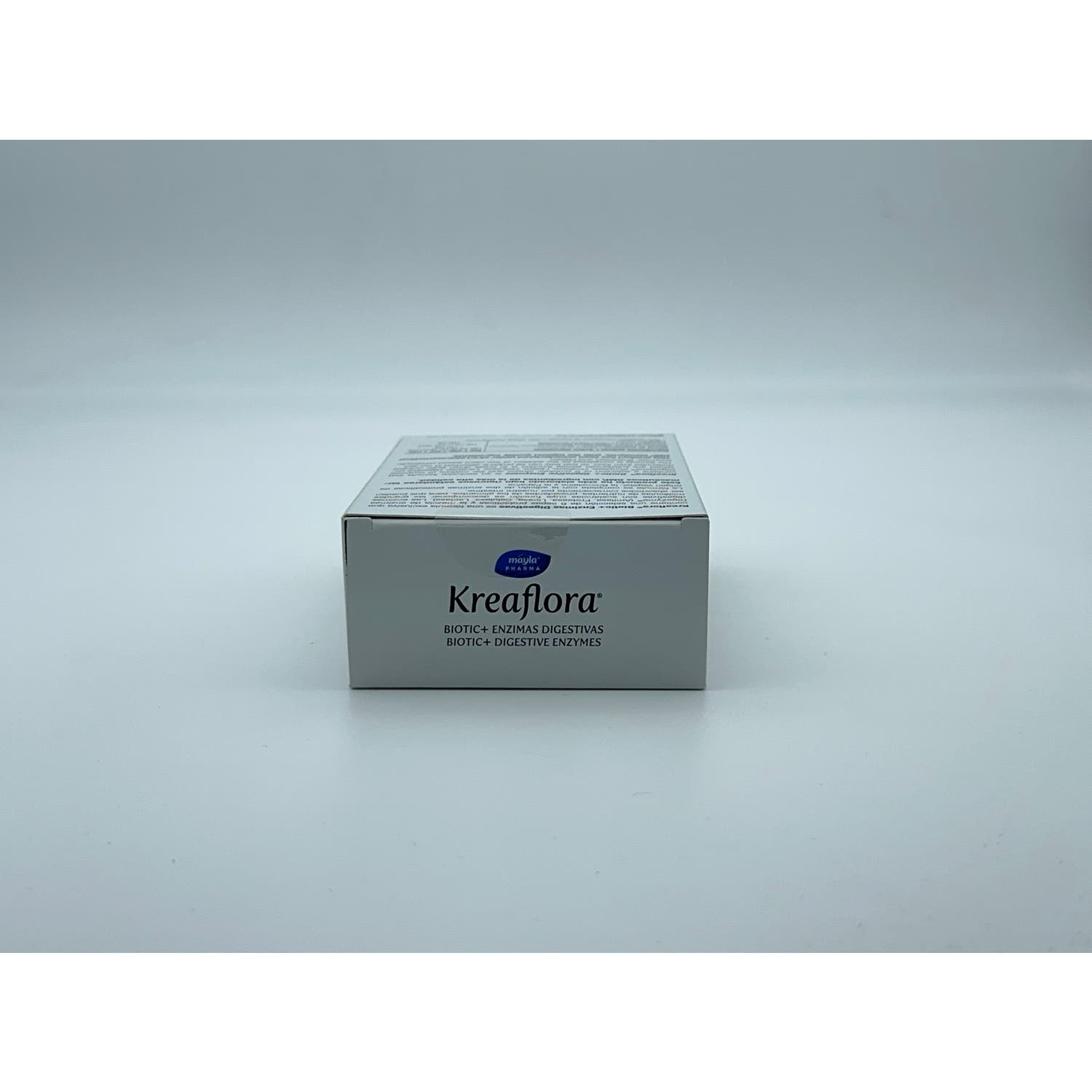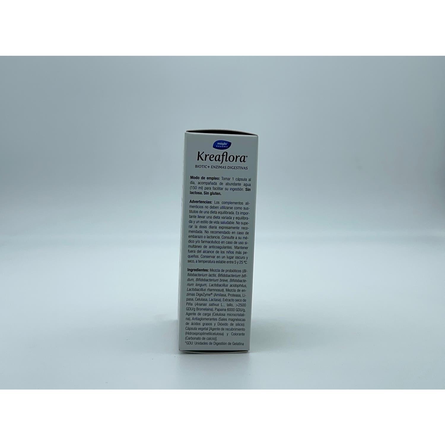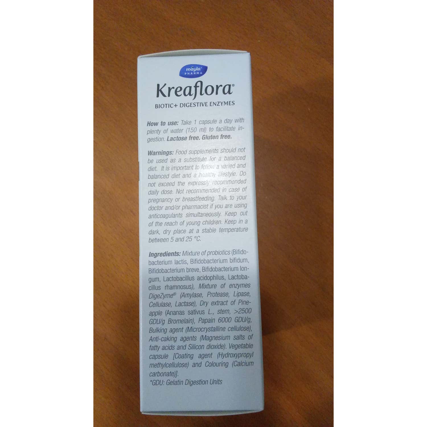 Mayla Kreaflora Enzimas Digestivas 30caps es un complemento alimenticio a base de probióticos que contribuyen a mejorar la digestión y a equilibrar la flora intestinal. Está formulado con cinco enzimas digestivas como son la amilasa, la proteasa, la lipasa, la celulasa y la lactasa; que facilitan la descomposición de las grandes moléculas de nutrientes para que el intestino pueda absorber las proteínas con mayor facilidad. Contiene 30 cápsulas.
