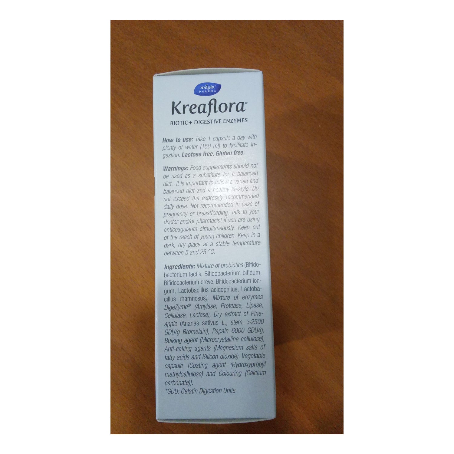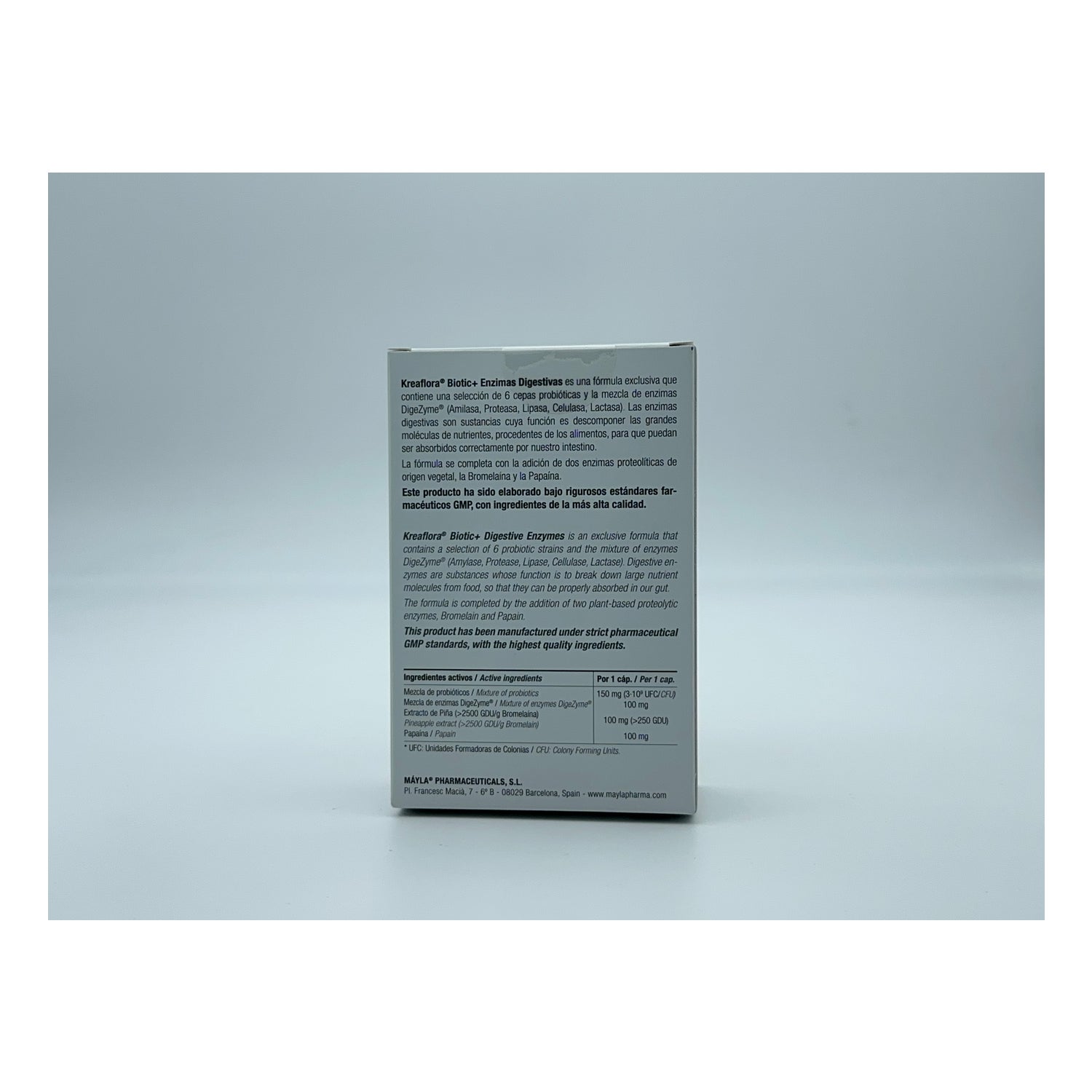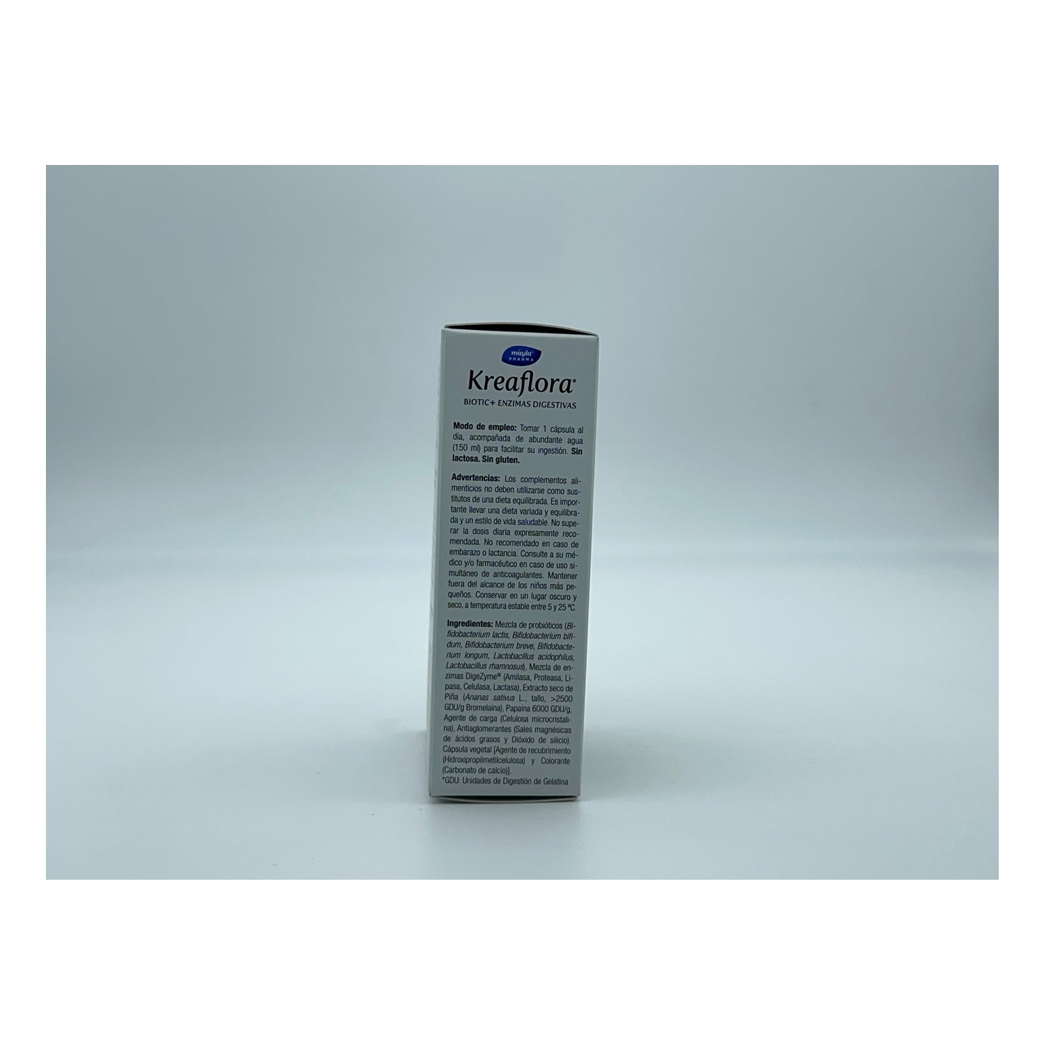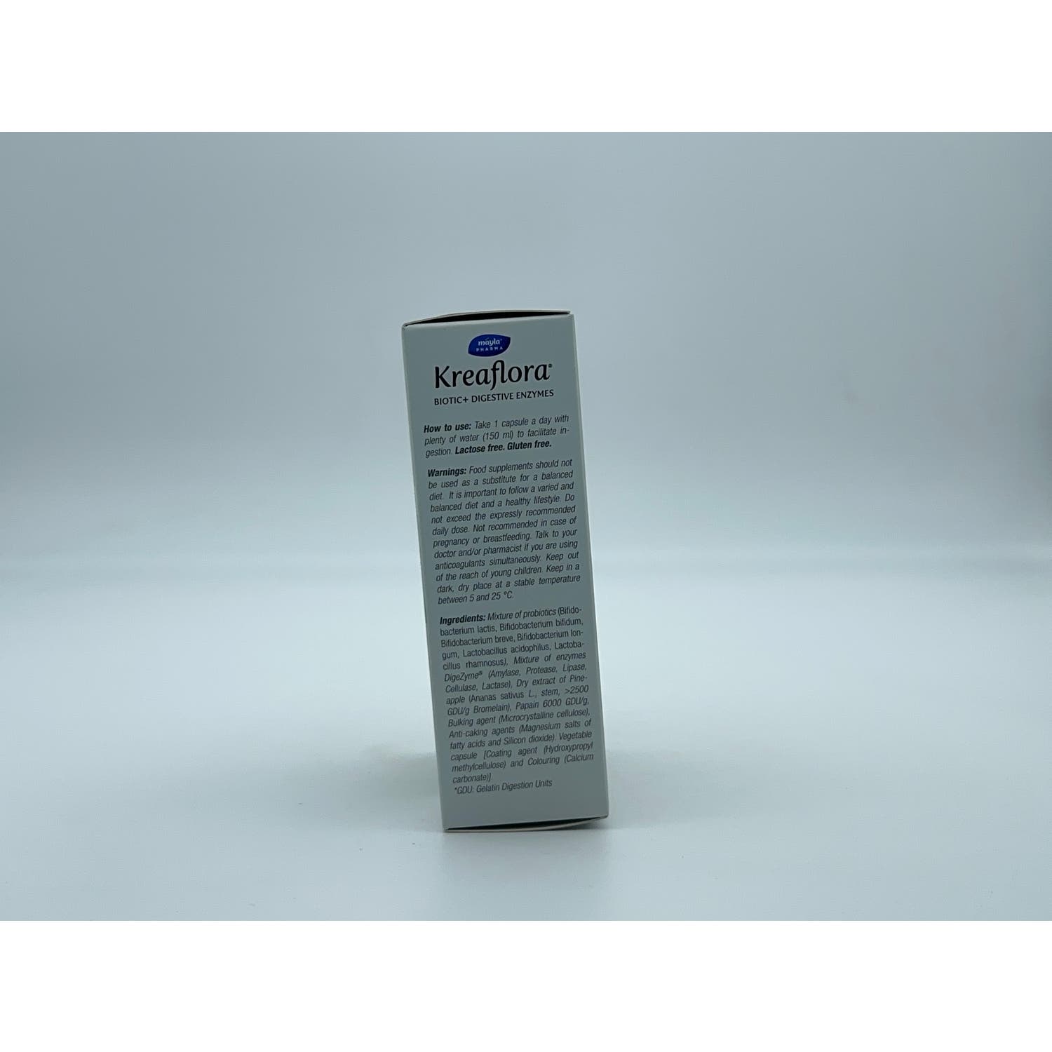 Mayla Kreaflora Enzimas Digestivas 30caps es un complemento alimenticio a base de probióticos que contribuyen a mejorar la digestión y a equilibrar la flora intestinal. Está formulado con cinco enzimas digestivas como son la amilasa, la proteasa, la lipasa, la celulasa y la lactasa; que facilitan la descomposición de las grandes moléculas de nutrientes para que el intestino pueda absorber las proteínas con mayor facilidad. Contiene 30 cápsulas.