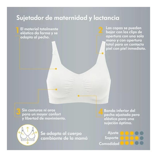 Sujetador para maternidad de la marca Medela, diseñado para usar durante el embarazo y lactancia. El material y diseño permite estirarse en cuatro direcciones diferentes, se ajusta a la forma cambiante para brindar un apoyo cómodo durante todo el día y en cualquier situación. No contiene costuras para libertad de movimiento. Presenta cómoda banda elástica debajo del pecho para mayor soporte. Fabricado 90% Nilón y 10% Spandex.