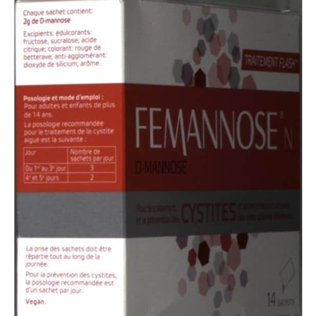 Femannose N D-Manosa Cistitis 14 sobres está indicado para el tratamiento y la prevención de la cistitis. Su fórmula, a base de D-manosa, un derivado de la glucosa, impide que las bacterias se adhieran al epitelio de la vejiga y elimina las que ya están adheridas. Su sabor natural a frambuesa está reservado a adultos y niños mayores de 14 años.