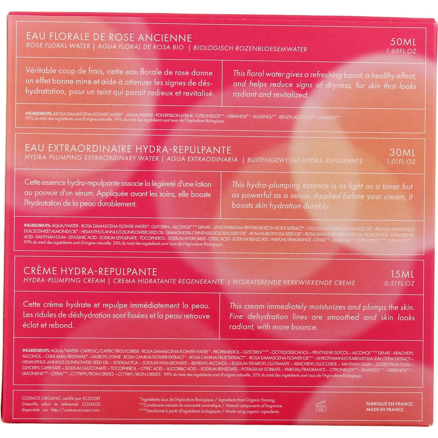 Por último, el cofre incluye la Melvita Source de Roses Crème Hydra-Repulpante Bio en un tamaño de 15 ml. Esta crema, enriquecida con ácido hialurónico, ofrece: