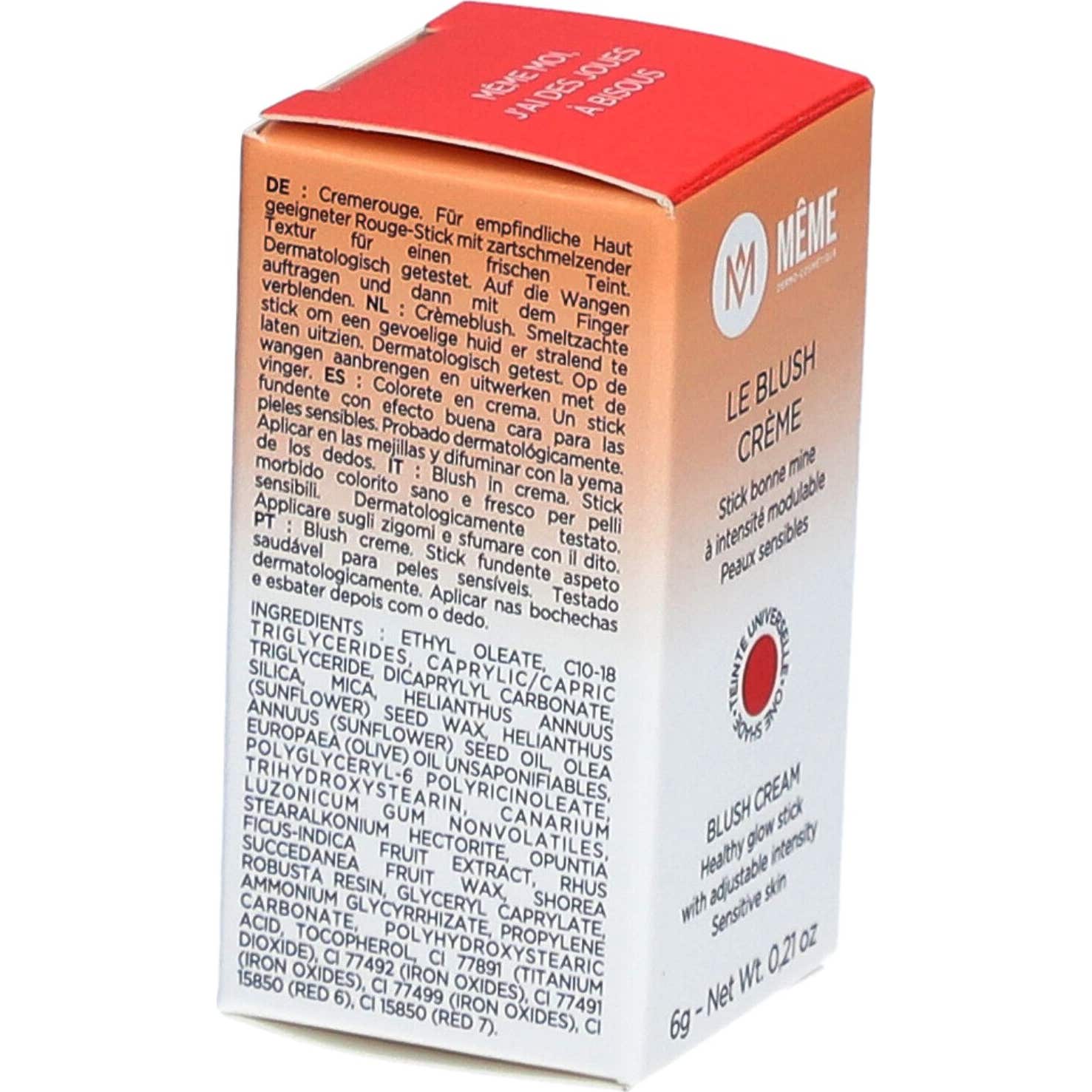 Même Blush Crema en Stick 6 gr es un producto diseñado para añadir un toque de color al rostro, especialmente formulado para las pieles más sensibles. Su textura cremosa y su formato en stick permiten una aplicación fácil y precisa, lo que lo convierte en una opción ideal tanto para expertos como para principiantes en el maquillaje.