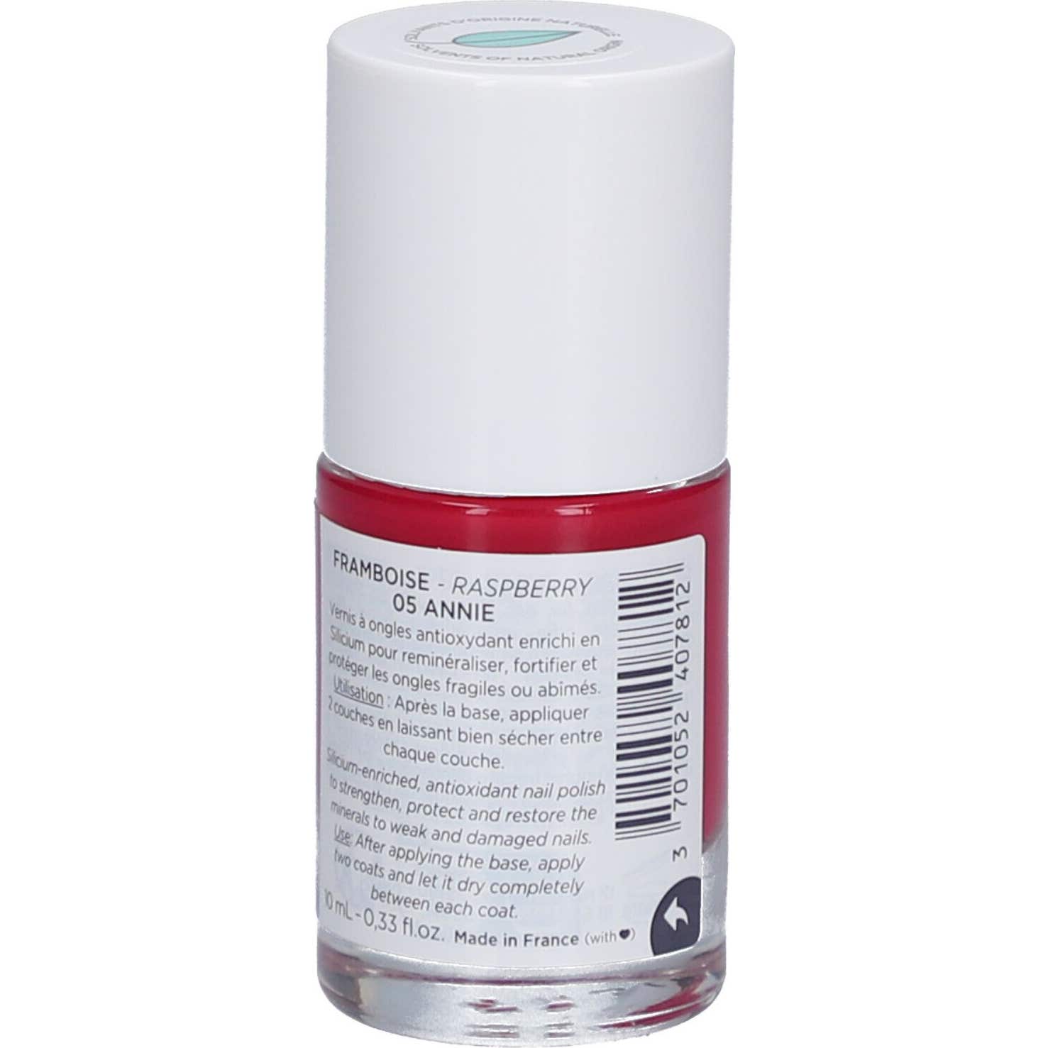 Esmalte de uñas enriquecido con silicio, un adhesivo orgánico que contribuye a fortalecer las uñas rotas, estriadas, blandas o partidas. Gracias a su cobertura opaca de color frambuesa, ayuda a proteger las uñas de los rayos UV y a evitar que se oscurezcan a causa de la quimioterapia. Su fórmula 10-Free y vegana está basada en disolvente naturales de origen vegetal que contribuyen a respetar las uñas.