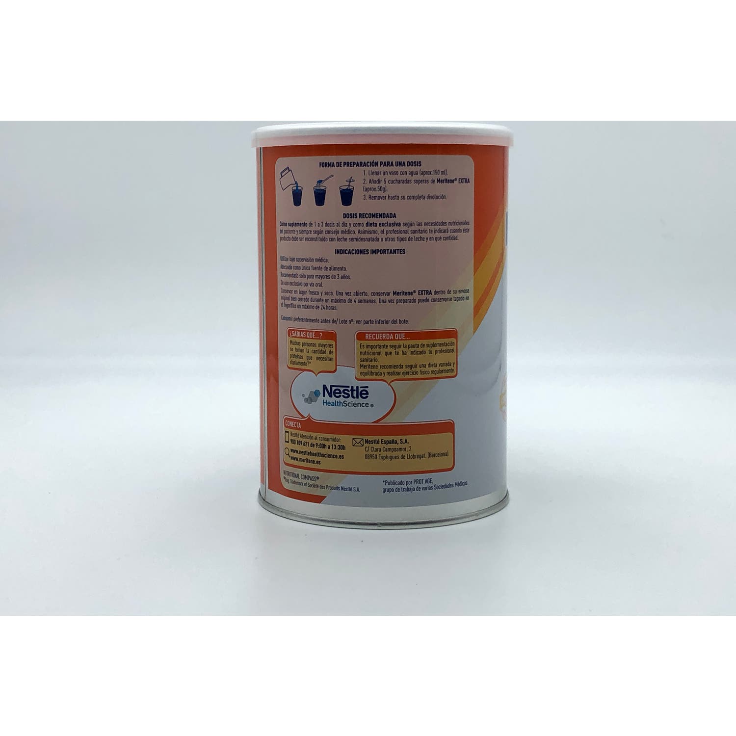 Nestlé Meritene Extra Sabor Chocolate 450g es un complemento alimenticio hiperproteico y normocalórica que funciona como alimento para usos médicos especiales.
